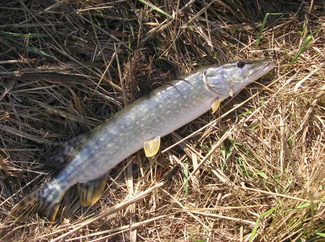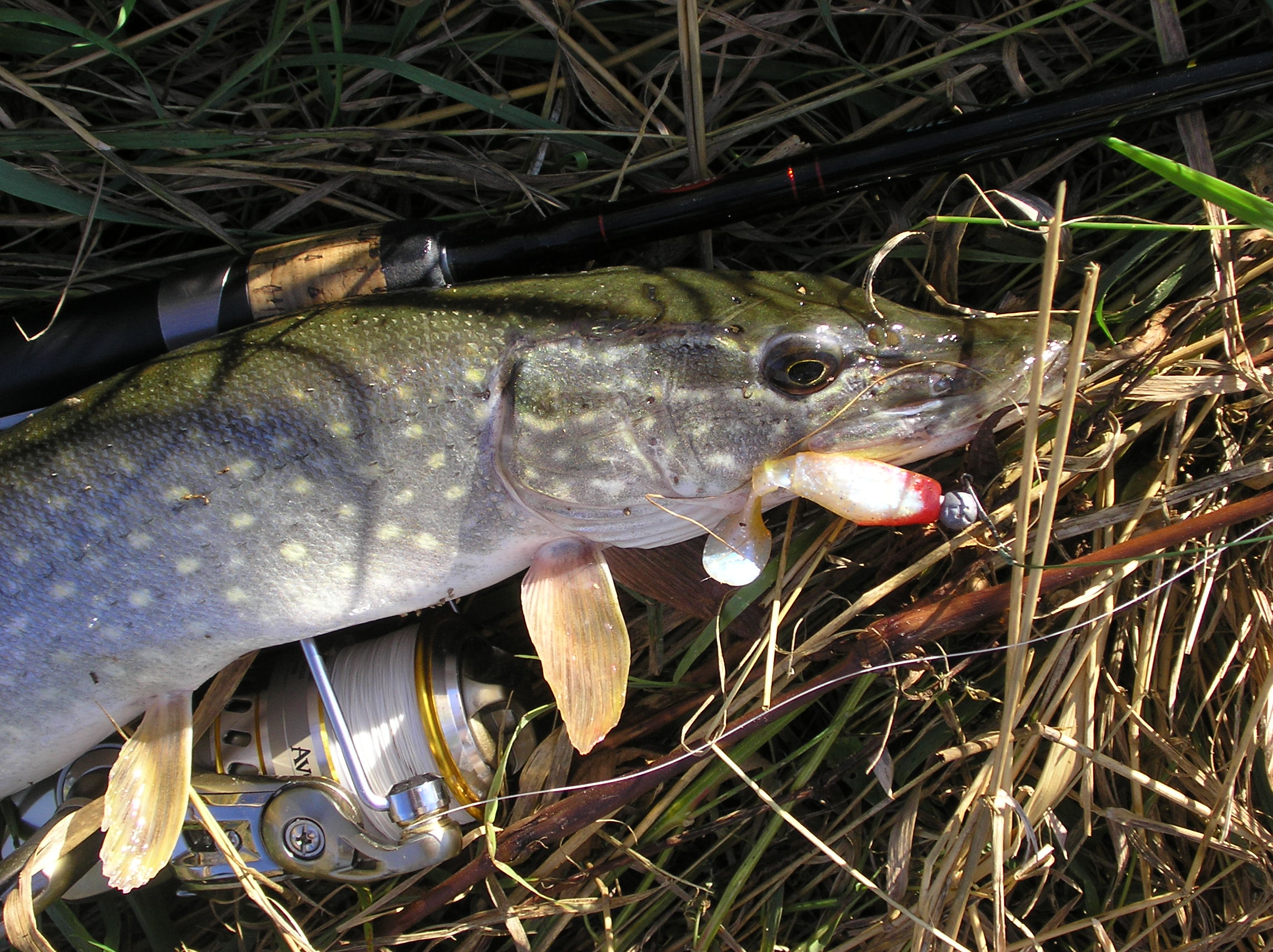 Az már pár perc után tisztán látszott, hogy nincs annyi kishal a pályán, mint legutóbb itt jártamkor, és a csukák sem igen mutatták magukat. A part viszont tömve volt az októberi nyártól megbódult kecskebékákkal. Lassan elindultam felfelé, míg barátom a hozott fagyasztott kishallal próbálta a csukákat átverni. Aztán a hírek lassan beigazolódni látszottak. “Feleslegesen” jöttünk ilyen korán, a hírek is arról szóltak, hogy dél körül kezd el enni a hal. A múltkor jól bevált helyek sem adták a halat. 11 felé hívott a főnököm Laci, hogy: Mi a helyzet? Én beszámoltam neki a nagy semmiről, de ő biztatott, hogy mindjárt meg lesz az első. Már dél idő lesz enniük kell! A következő beálló legutóbb több halat is adott. Egy gondolattól vezérelve feltettem egy delalande sandrat, amit egy internetes ismerősöm igen preferál ezen a vízen. Már a lábam alatt járt a csali, láttam, ahogy ingerlően mozog a farka a vízben, mikor egy fejmérete alapján kettes feletti csuka váltott ki rá a nád tövéből, de elvétette. Nem akartam elhinni! Végre ott volt a hal, de elbénáztam. Kicsit lejjebb dobtam, hátha a csuka visszább állt, sajnos a zsinór beakad egy vízre hajló nádszálba. Míg avval vacakoltam újra leverte a csuka. Meg is akadt, de sajnos csak egy pillanatra. Utána többször visszatértem még ide különböző gumikkal, hátha visszaállt a helyére, de nem sikerült becsapnom őkelmét. Lefelé menet aztán Balázs hívott, hogy semmi nem jött úsztatva, kishalat sem tud fogni, így elindult felém pergetve. Amikor a következőt dobtam a túl part irányába éles ütést közvetített felém a botom. Bevágtam és végre a jól ismert érzés kerített hatalmába. Halam volt! Nem volt egy óriás, de a folyóvízi halakhoz méltóan méretét meghazudtolva harcolt a 45-ös körüli példány.