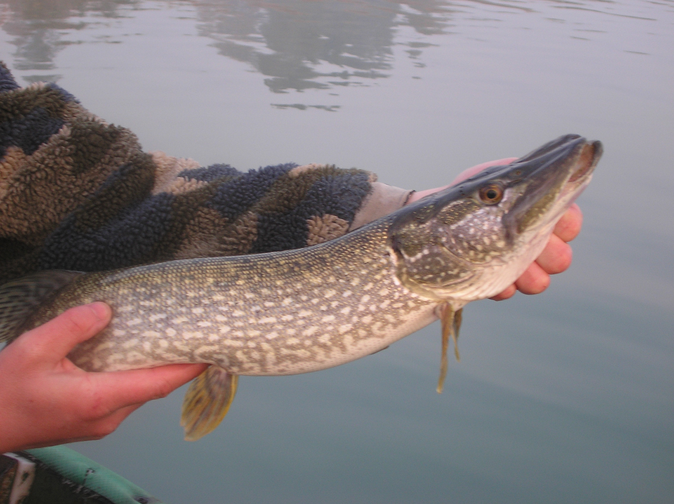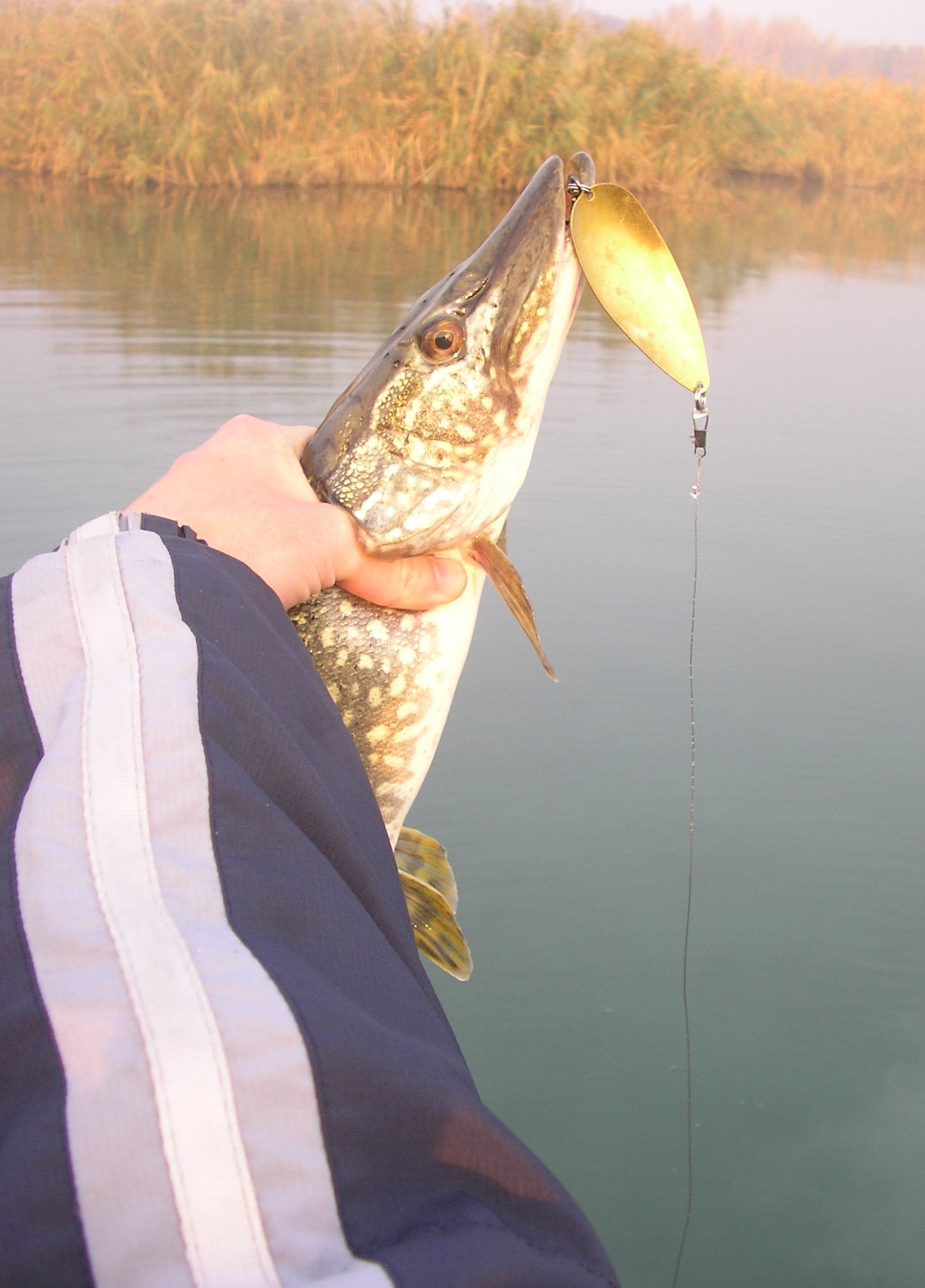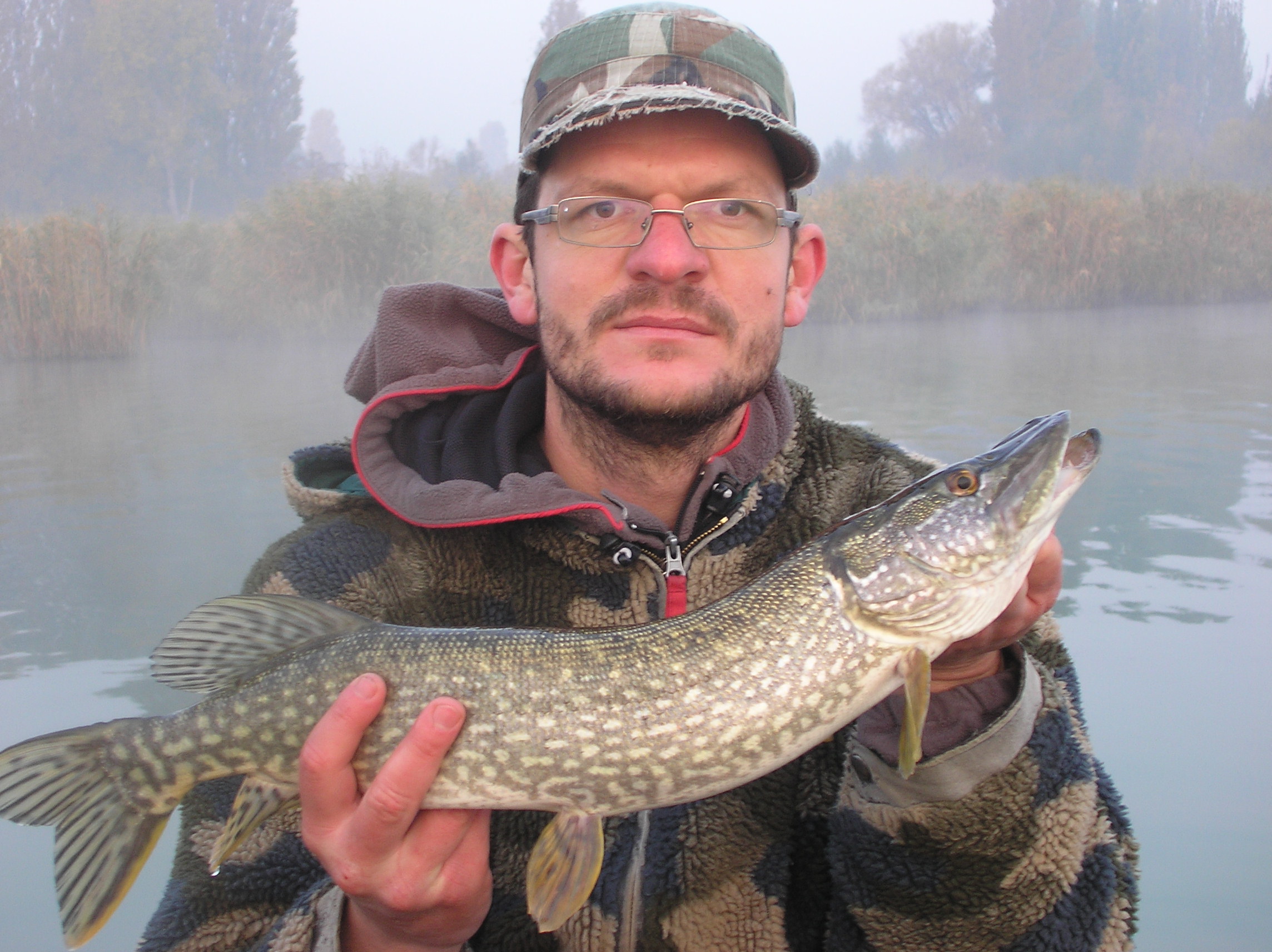 A mai napra meghívást kaptam egy csónakos pergetésre, ami egy kisebb gyomorrontás miatt majdnem meghiúsult, de úgy döntöttem kockáztatok, mer vártak rám a csukák és reménykedtem a balinokban is. Sajnos az utóbbi időben partközelből teljesen eltűntek, pedig ebben az időszakban már csapatostul szokták mutatni magukat a mólók környékén. Fél hétkor már a vízen voltunk, ezen a csípős hideg reggelen. A dér bizony ráfagyott a stégre és a csónakdeszkára, és sűrű köd borított mindent. A víz kristálytiszta volt, még 50-60 méterre a nádastól is le lehetett látni a fenékig. A csónakkijáróból szép sügérek rebbentek szét, de most nem volt rájuk idő. Csukát szerettünk volna fogni! Balázs gumival, én a szokásos támolygóval kezdtem. Sorra vallattuk az öblöket, Balázs cserélgette a csalikat, wobblerek, gumihalak, majd kedvenc támolygó került a kapocsba. Gondoltam kipróbálok egy körforgót, amire először gondoltam az nem volt a dobozomban, így egy piros hármas meppsre esett a választásom. A kristálytiszta vízben az egyik hínarasból egy 55-ös csuka verte le a kis körforgót. Nagy élmény volt a fárasztása, mivel minden pillanatát láthattuk. Ahogy tátott szájjal, tágra nyitott kopoltyú fedőkkel rázta a fejét a víz alatt az nem volt semmi látvány. Többször betört a csónak alá, de végül nyakon csípnem a gyönyörű ragadozót.