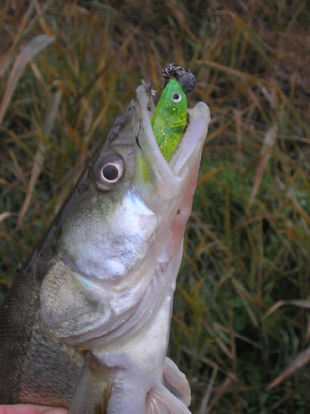Mivel a továbbiakban csak ütésekig jutottam, ezért a csaliváltáson kezdtem gondolkodni, mikor a part mellett közvetlen ütésem volt, de nem akadt. Visszapöccintettem a kis gumihalat, és már le is verte egy elég sovány 42-es csuka a csalimat.