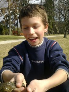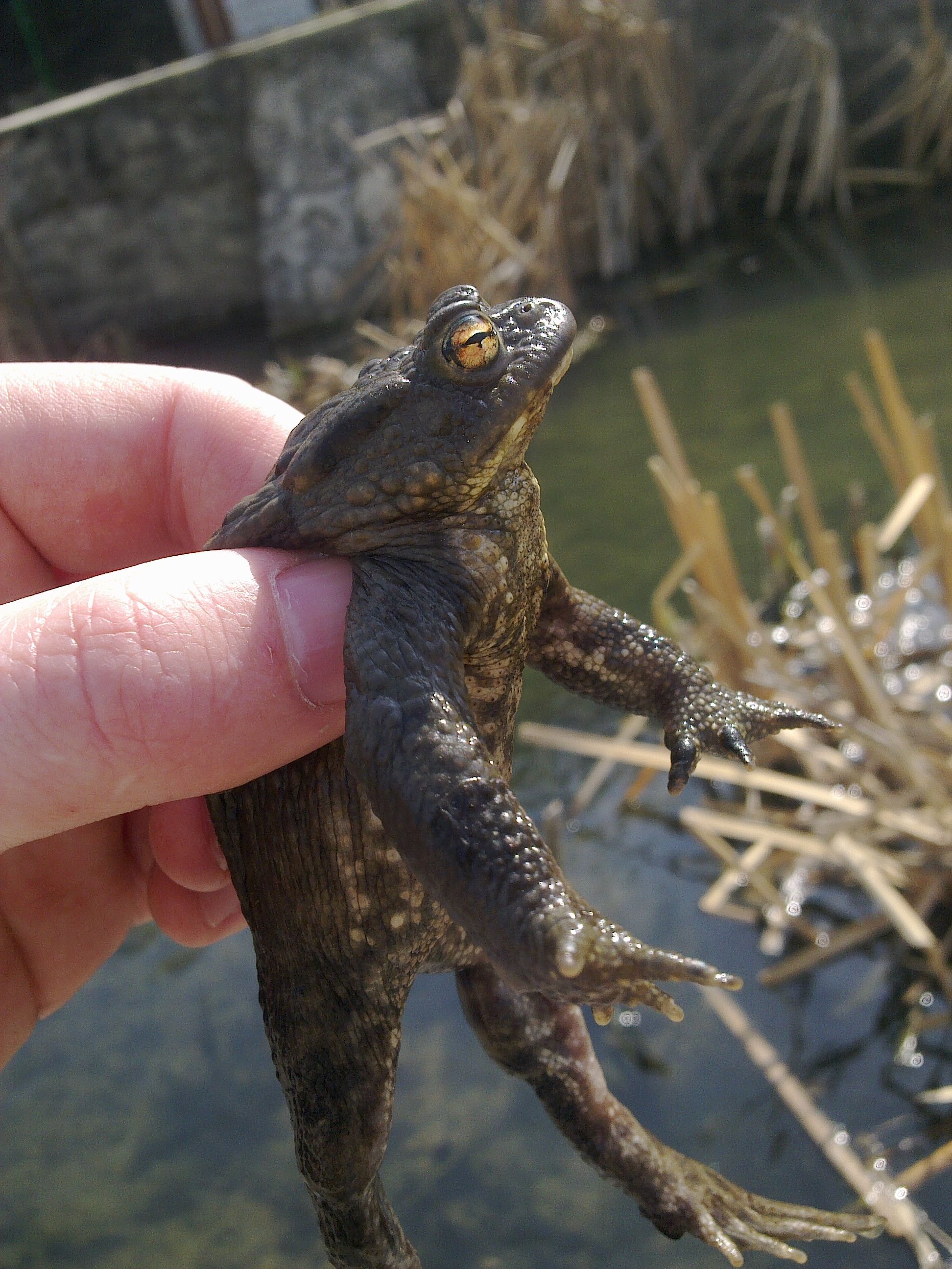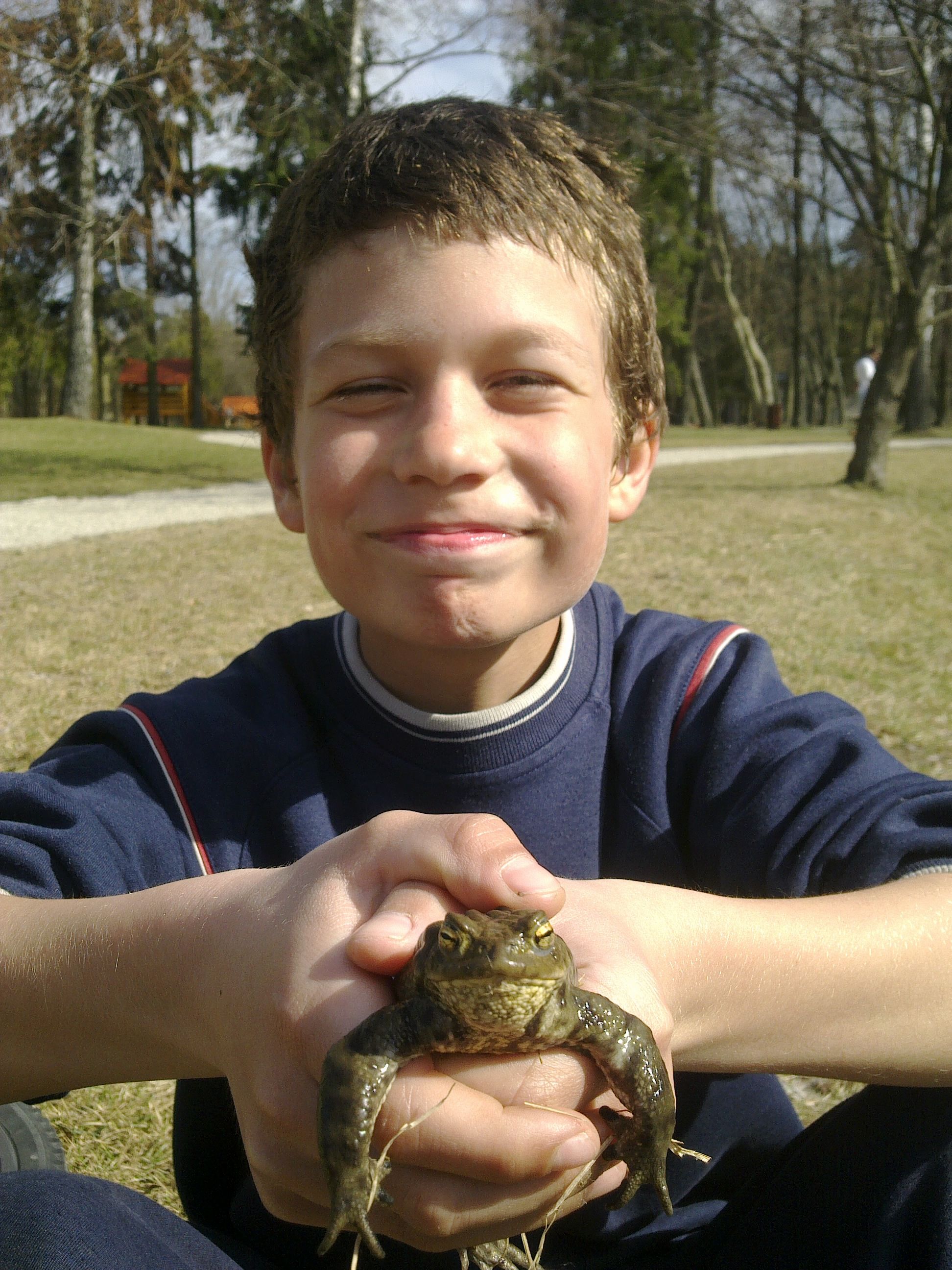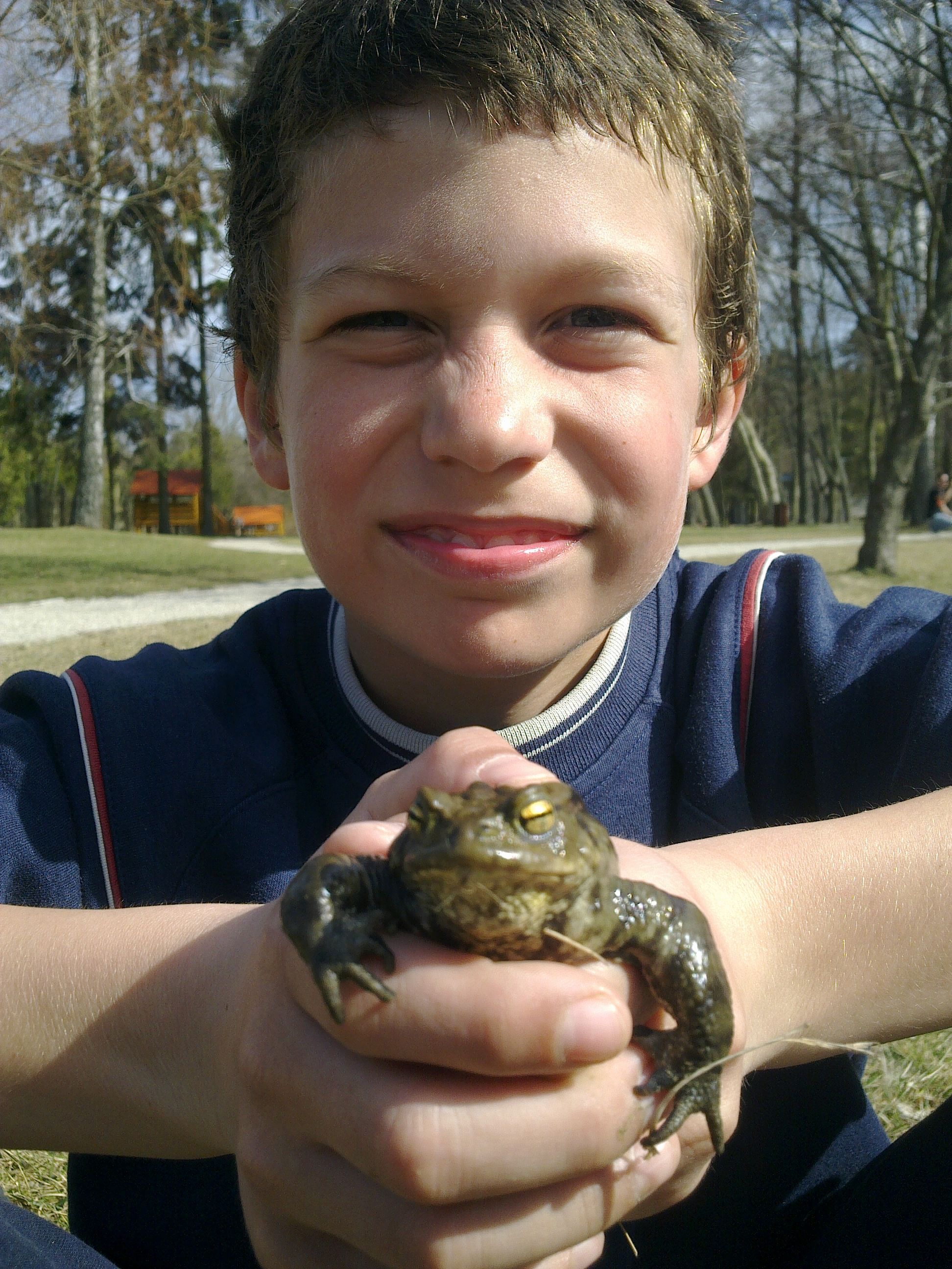 Akadt még egy történet, ami a halfogással nem de a természet gyerekkel történő megismertetésével szorosan összefügg. Békázni voltunk a helyi patakból felduzzasztott némileg rendbe tett régi Vidámparki tavon. A kis békák és a nagy kecskebékák túl élénkek voltak ahhoz, hogy vízbeesés nélkül elkapjuk őket, de néhány a téli kómából épphogy ébredező varangyot azért sikerült elkapnunk. Ami még érdekesség, hogy a tóban 4 valószínűleg a terráriumot kinövő megunt házi kedvencet is láttunk ékszerteknős képében. ebből 3-at sikerült is levadásznunk. Ha nem tavasszal rakták ki őket, akkor nagy túlélők, hogy ezt a viszonylag kemény hideget kibírták.
