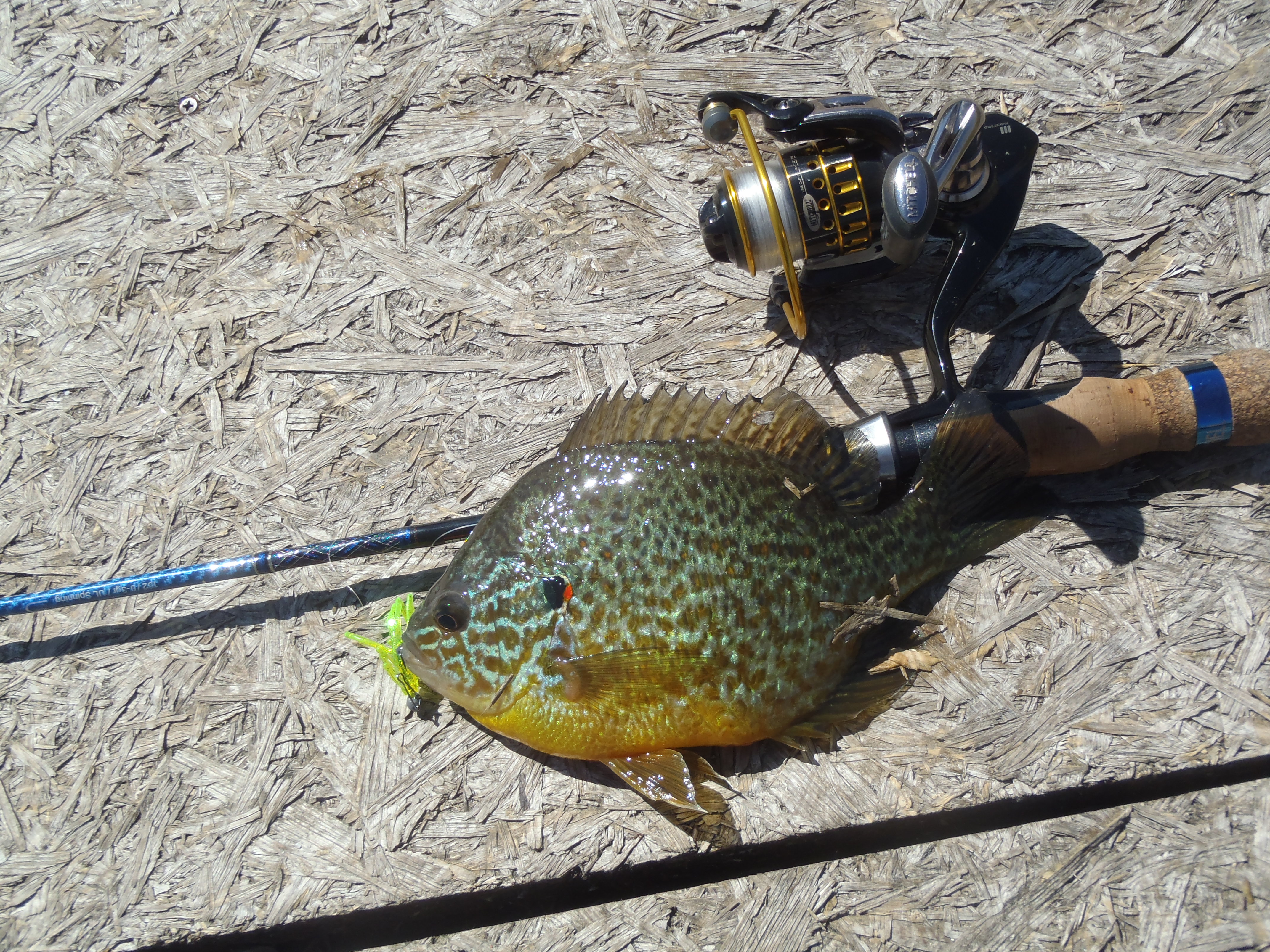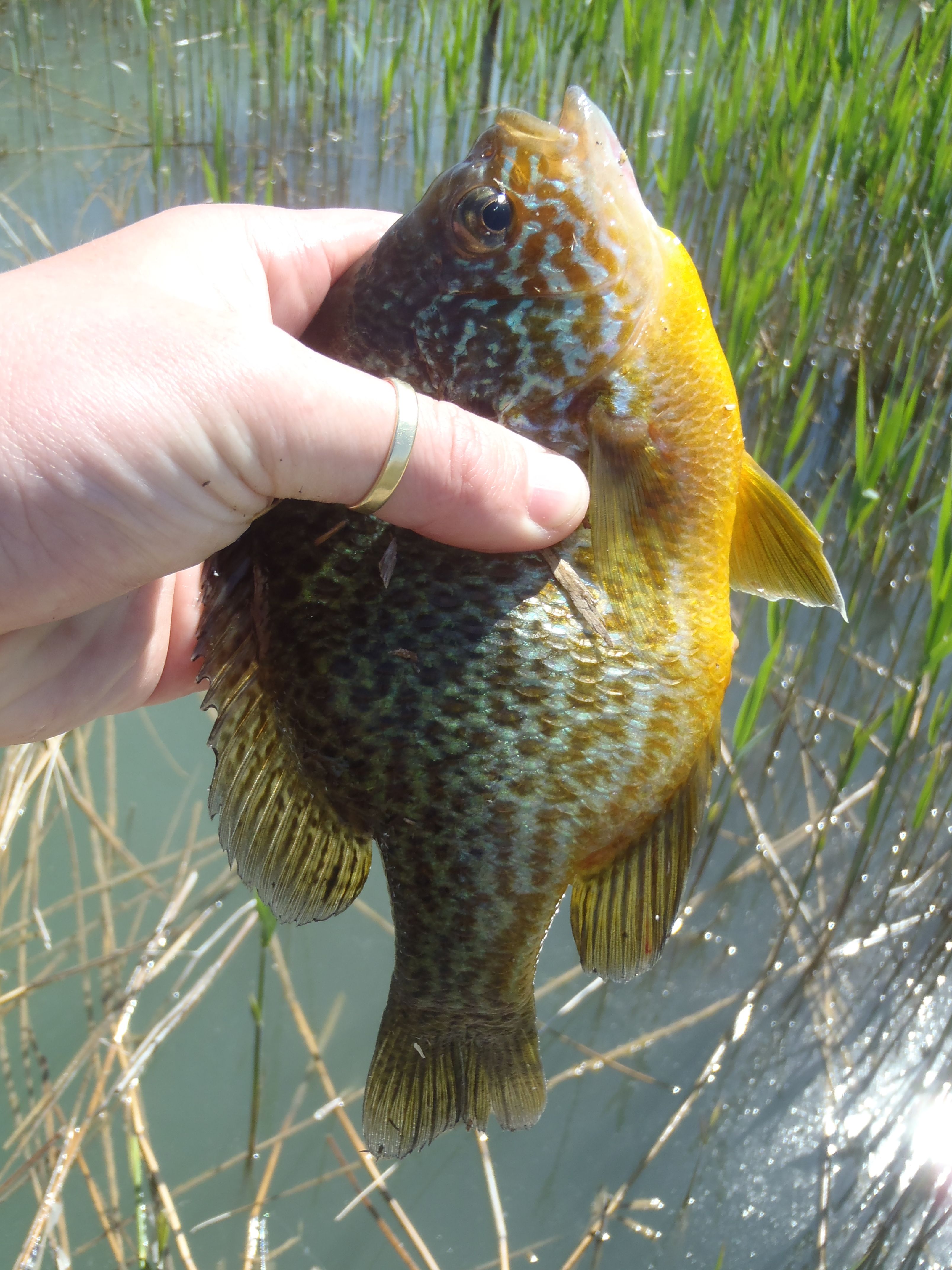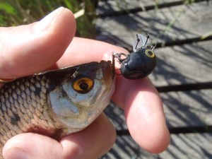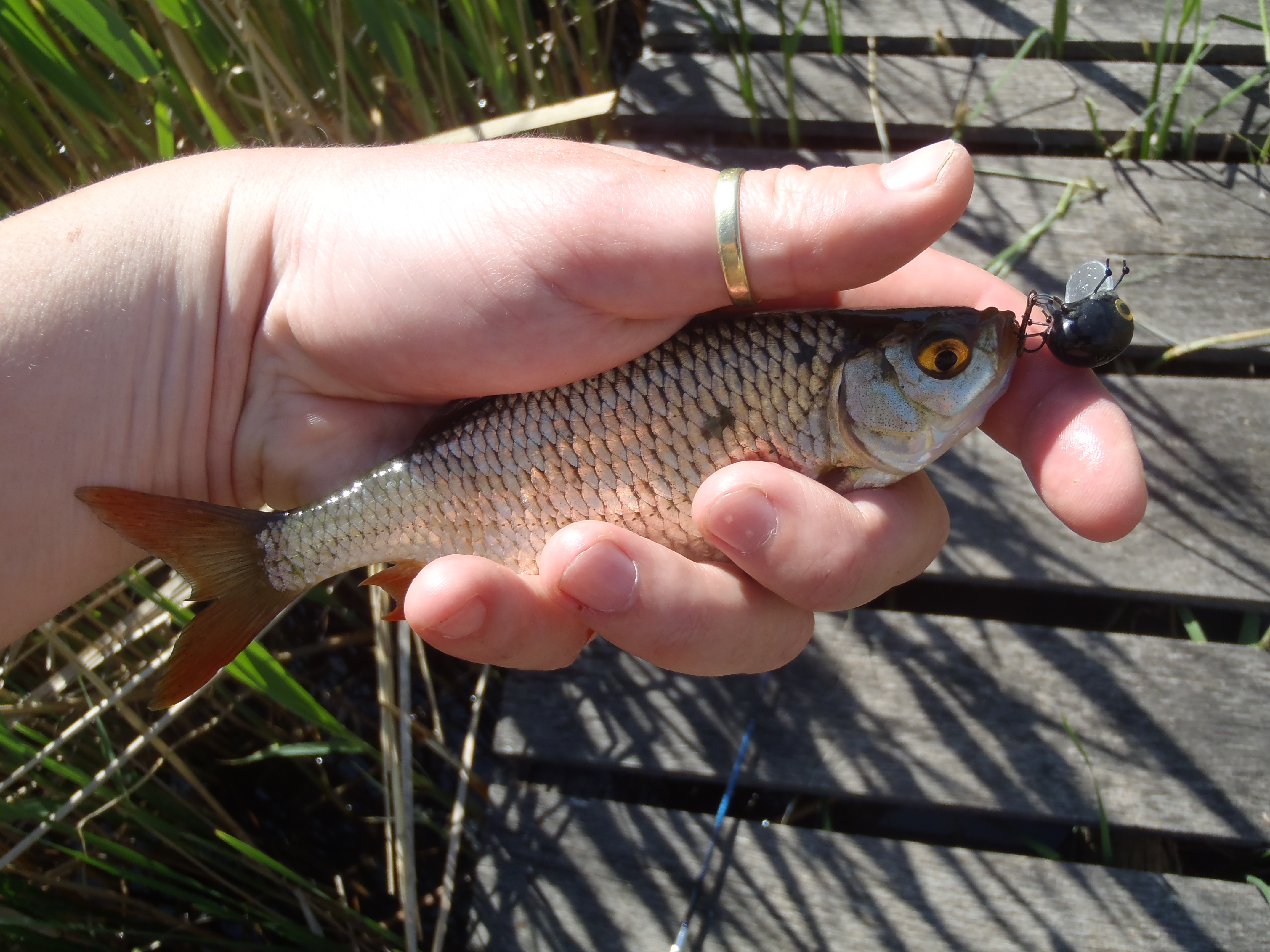 Próbáltam más csalikat is, de semmire nem volt jelentkező, az időközben letisztult vízben. A nimfa hozott még egy bónuszhalat is, egy 19 centis naphal hörpölte fel a csalit. Fogtam még ezen kívül egy gyönyörű kis pirosszárnyút, ami egy fórumtársam által készített hendméd bogarat kapott le a víztetőről. Valami hasonló lehet, amikor a domolykó leveri a beesőt! Sajnos még nem volt benne részem. Volt egy nagyobb pirosszemű is, de az csak böködte a beeső bogarat, nekem meg mennem kellett. Így is kifutottam a tüdőmet, hogy elérjem a buszt.