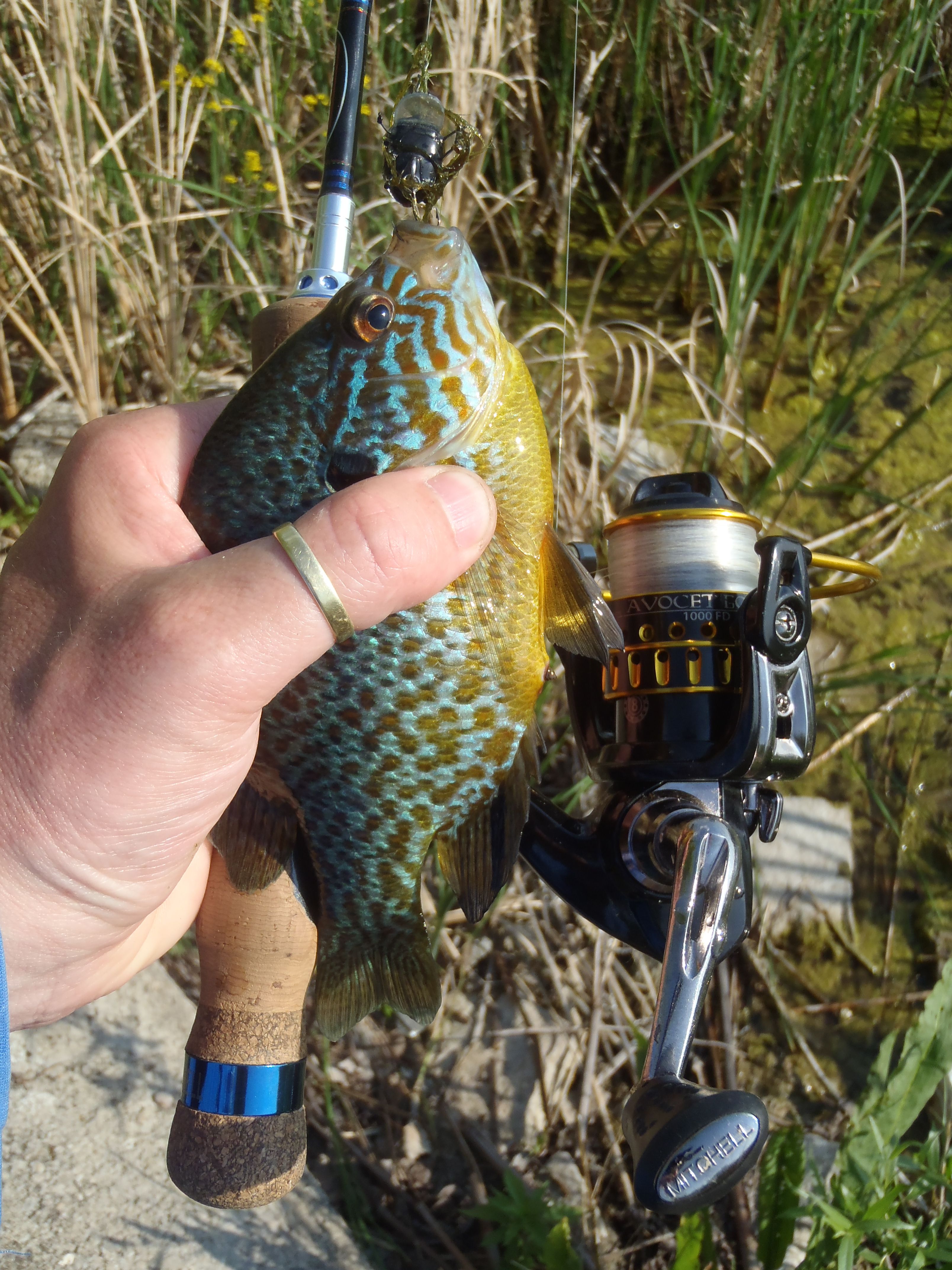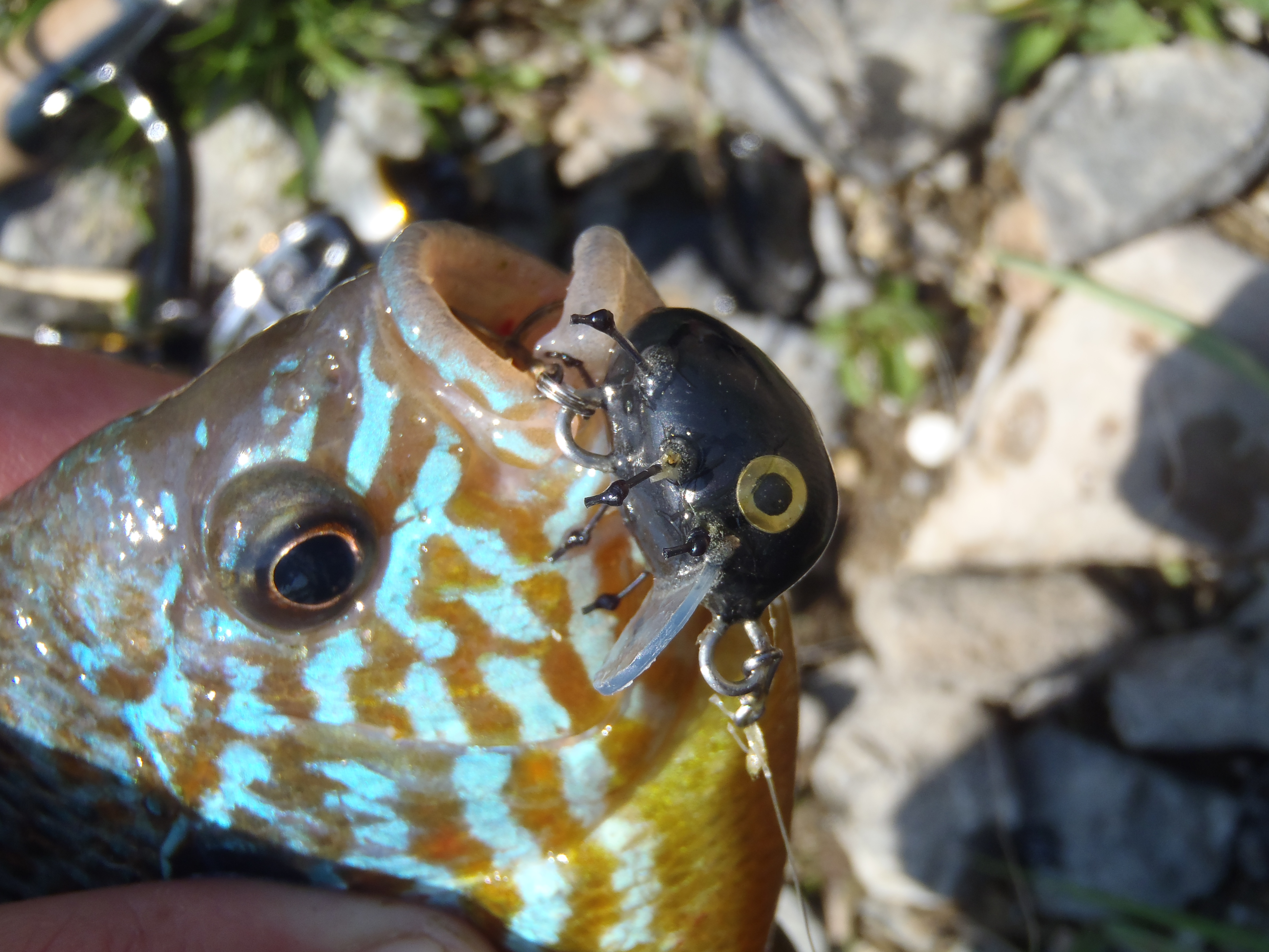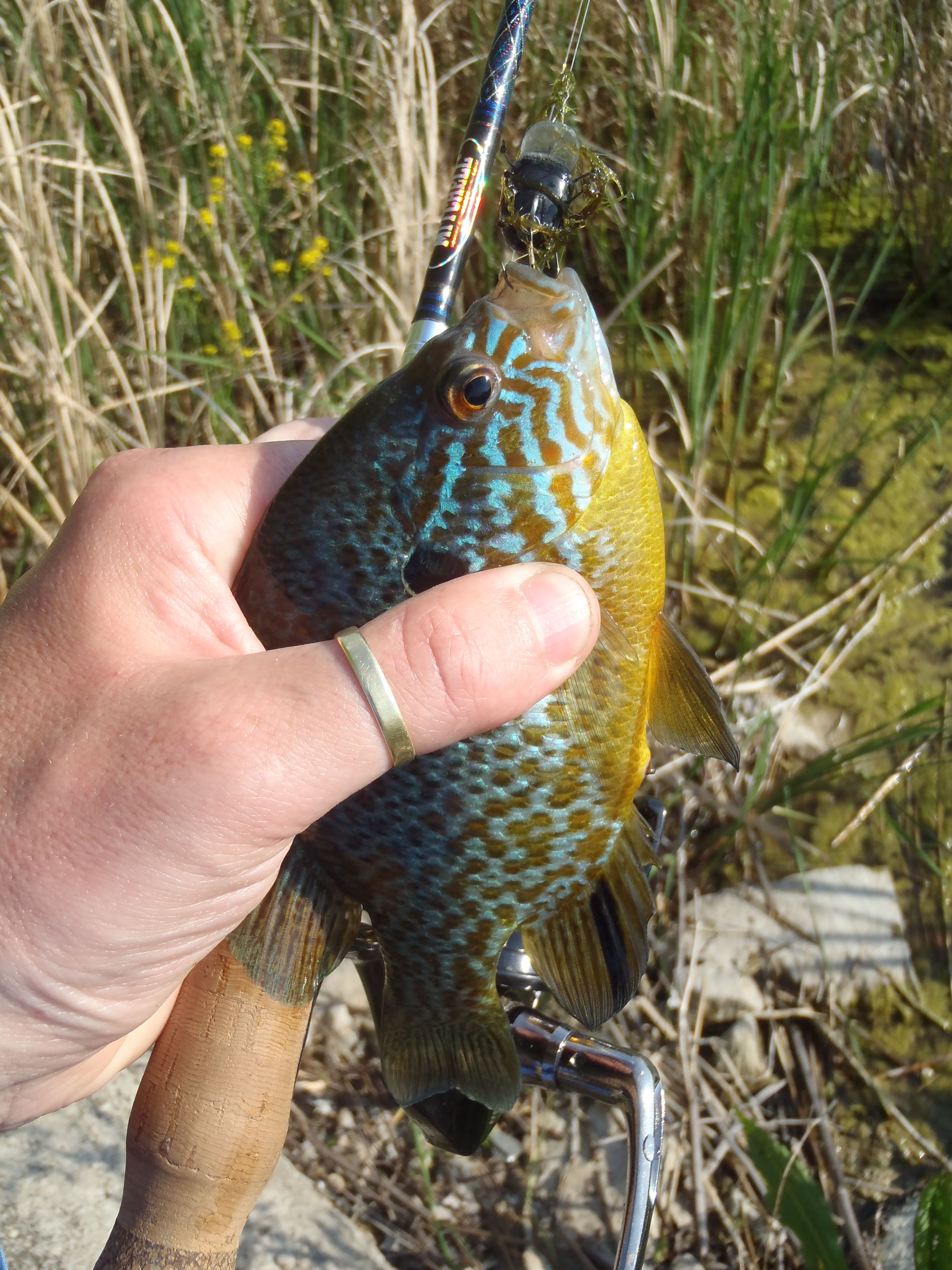Szóval másfél óra után dobtam az elsőt az iszonyat hőségben csukára, nem túl nagy hittel és meggyőződéssel. Az egyik kisvizes medencében rengeteg naphal volt, ahol sikerült kettőt becsapnom. Mindkettő a táplálék konkurens elől kapta el az apró bogarat.