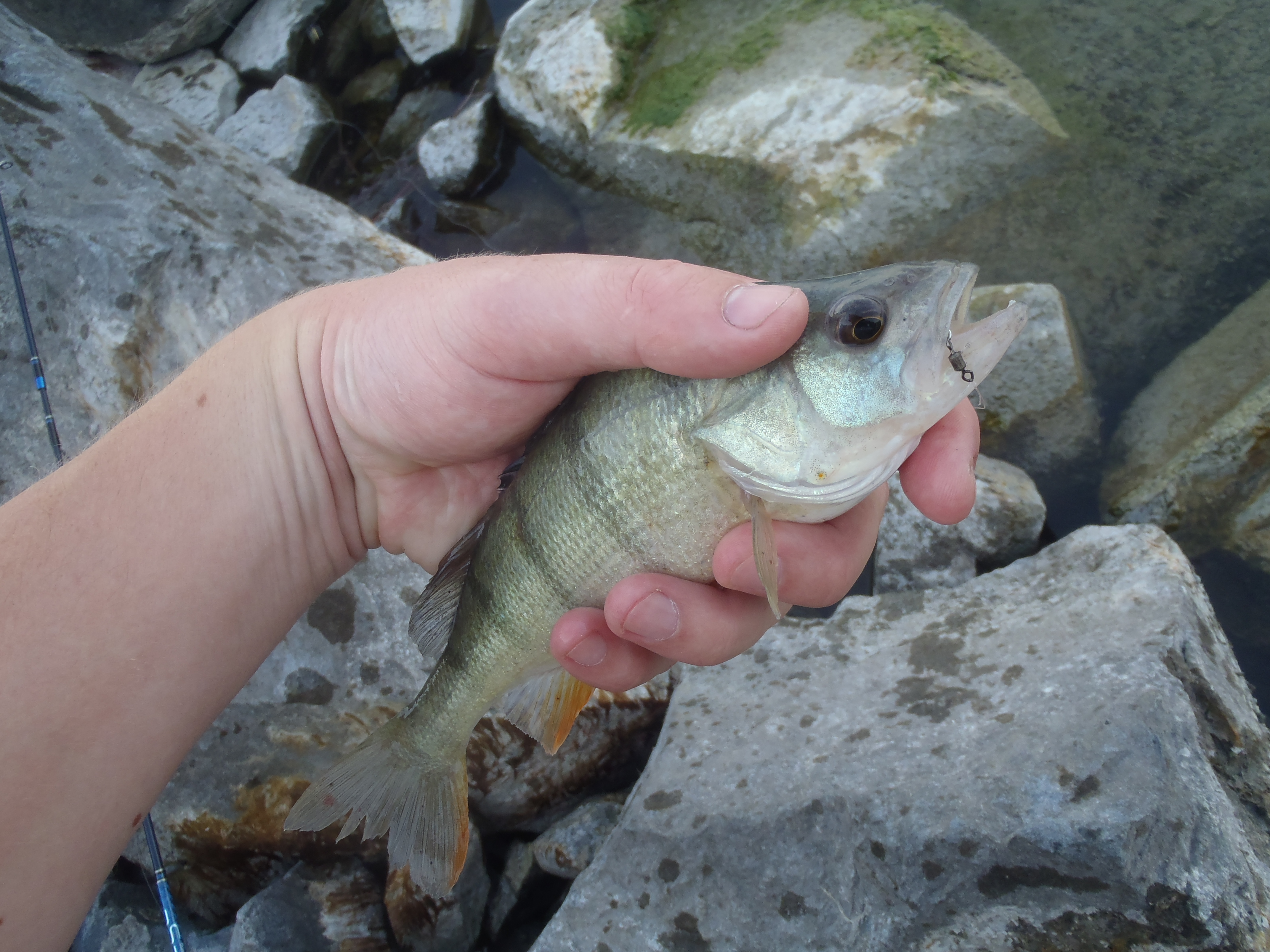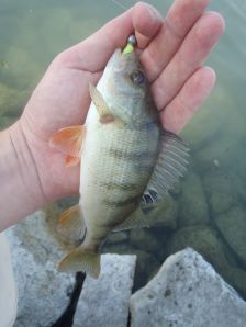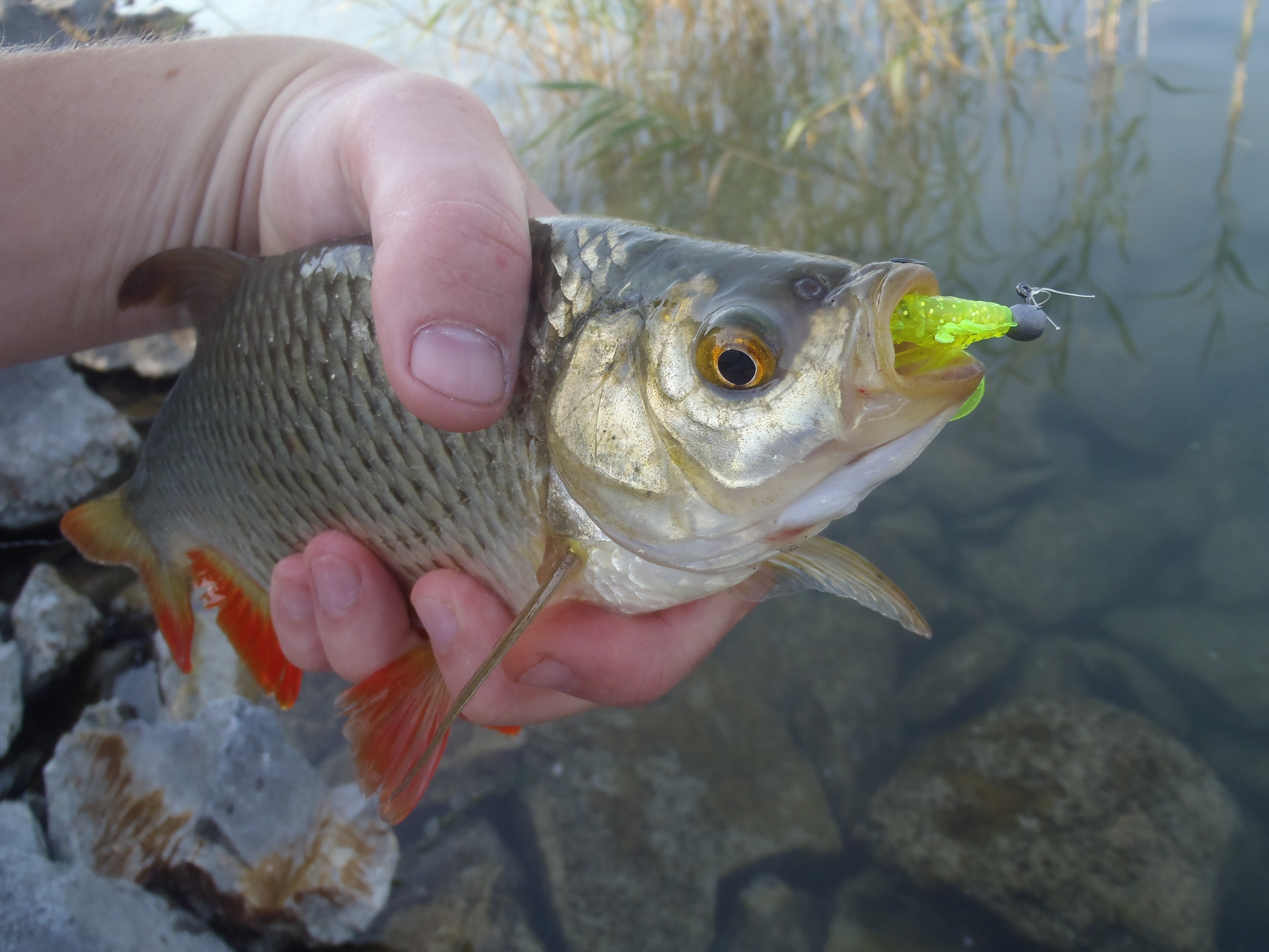 Strandolás előtt kaptam ma két órát. Csak az UL-t vittem a kövezésre, persze, hogy ott voltak a balinok, de a finom felszereléssel elérhetetlen távolságban. Nem bosszankodtam sokáig, kis sárga twisterrel próbáltam vörösszárnyút fogni a múltkori helyen. Első dobásra már sorozta is valami. Másodikra szép sügér jött, a társa a partig követte. Nimfa került a jigre, elsőre leverte valamim komoly hal, ami egyből a hínárba rohant, így lemaradt. Nem volt több kapás így odébbálltam. Újabb sügér jött kistwisterre. Amikor már visszafelé indultam megláttam a kő előtt egy gyönyörű vöröskeszeget. Elé ejtettem a nimfát és le is ütötte. Jó érzés látott halat elkapni, egy olyan csalival, amit az “ember fedezett fel”, hogy mennyi mindenre jó.