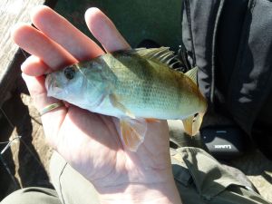 Sajnos erős keleti szél volt zavaros vízzel, így 20 percnyi evezés után jutottunk el egy olyan öbölbe, ahol meghívóm (továbbá M) a sügéreket remélte. Ahogy odaértünk mondta: Dobjál nyugodtan, én majd evezek, ha kell, nekem már az is nagy dolog, hogy végre kint lehetek! – ez ám az igazi hozzáállás, ide nem tudom mikor fogok eljutni, hogy már az is örömmel tölt el, ha kint lehetek. Nekem még nagyon fontos a halfogás élménye, kudarcként élek meg minden egyes NFLS-t. És napokig agyalok, hogy mit rontottam el. Első kapás első sügér! Mi lesz itt? – gondoltam akkor. M is szerelni kezdett, mire összerakta a finom pálcát már 5 sügérnél tartottam. M kétszer leakadt – nem érezte annyira a dobástávot, a vizet, meg úgy egyáltalán a pecát. 5 perc alatt 11 sügérnél tartottam, míg M fogott 4-5 darabot. Vegyes méretűek voltak, az opálos vízben a társak sokszor felszínig jöttek a megakasztott hallal. Sajnos az öböl bejáratától hamar megfogtuk a bandát, beljebb viszont annyira zavaros volt a víz, hogy kapás nélkül megúsztuk.