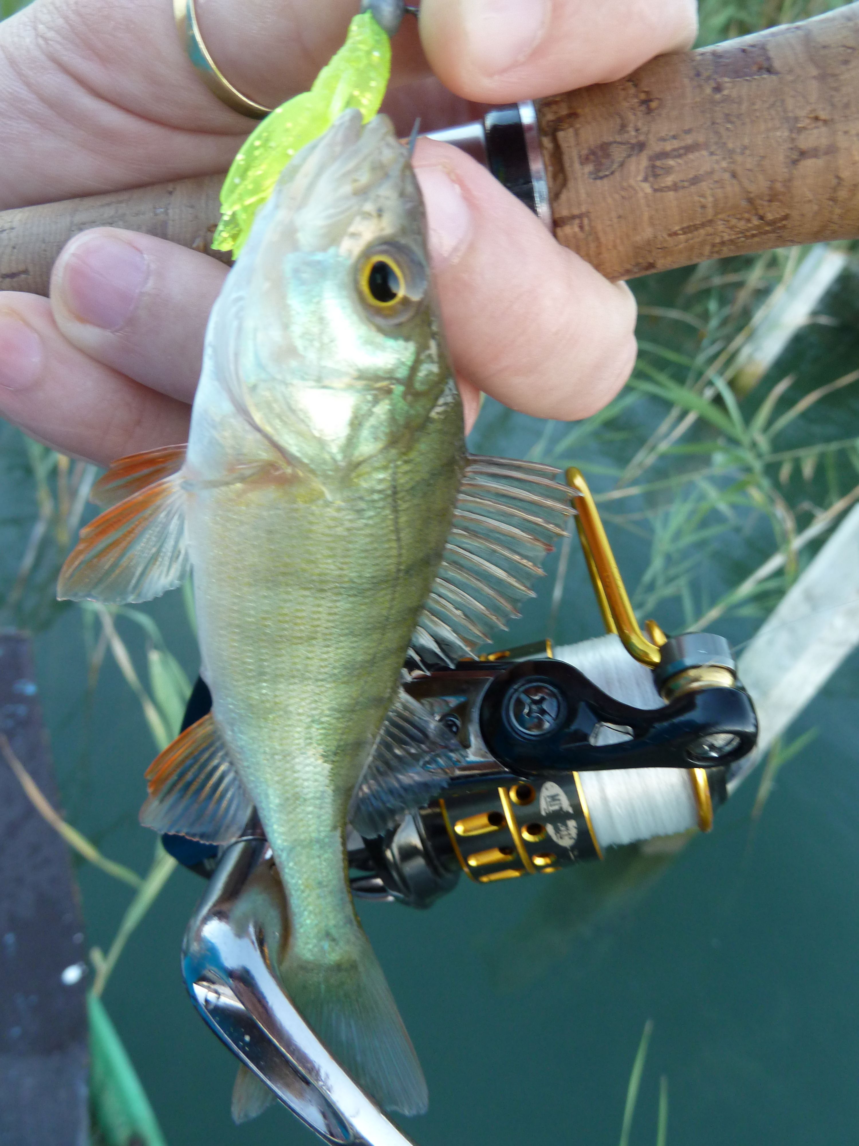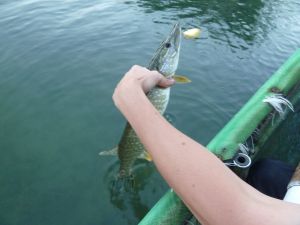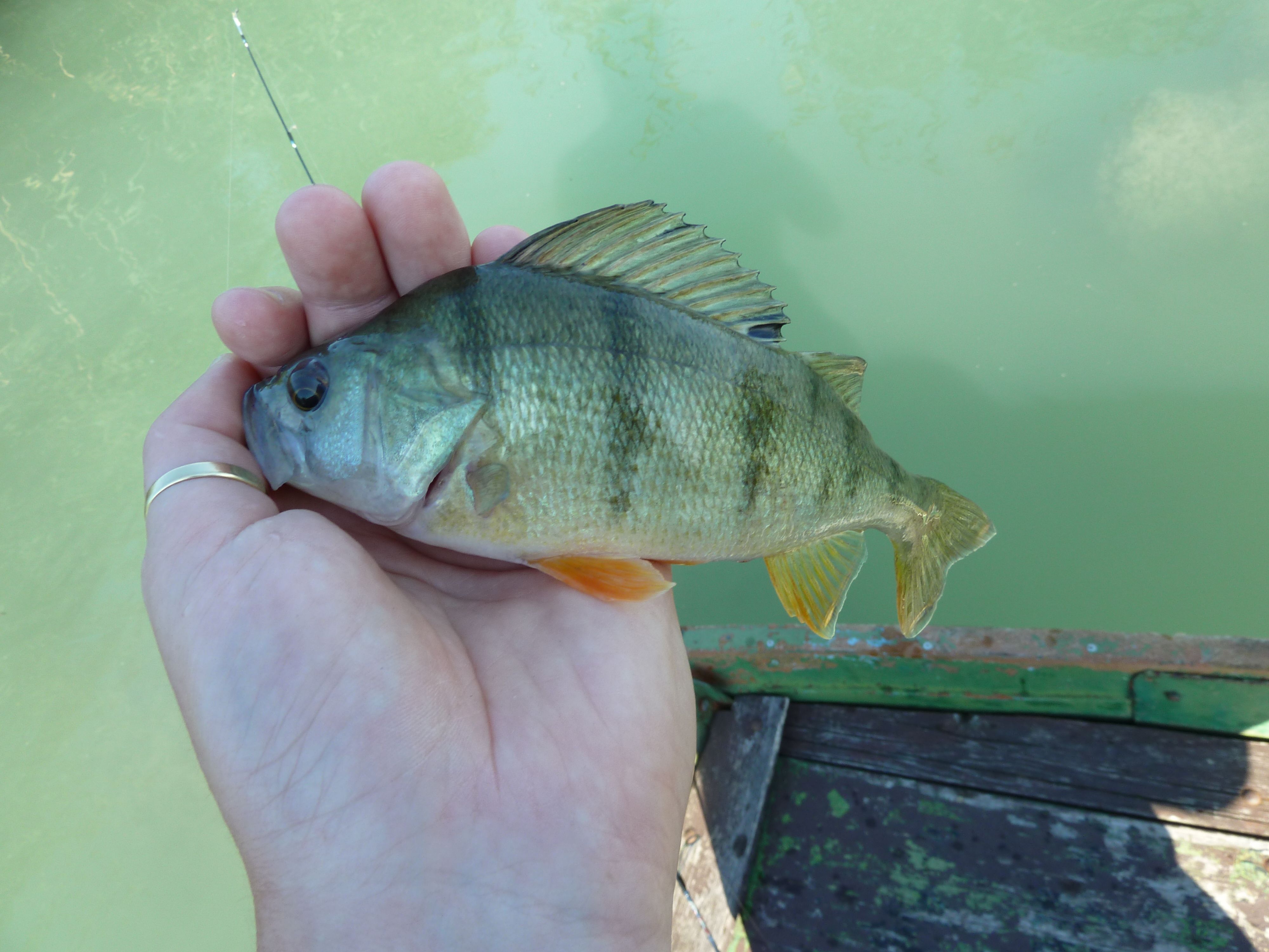 Én továbbra is a sügérekkel próbálkoztam, míg M megpróbált a letisztult vízben csukát fogni. Fogtam még 4 apróságot, és 2 naphalat, a második sajnos meglépett. Az elsővel egy időben M akasztott egy 38-as csukát, így egyszerre fáraszthattuk a halakat.