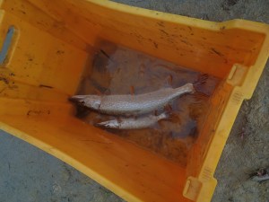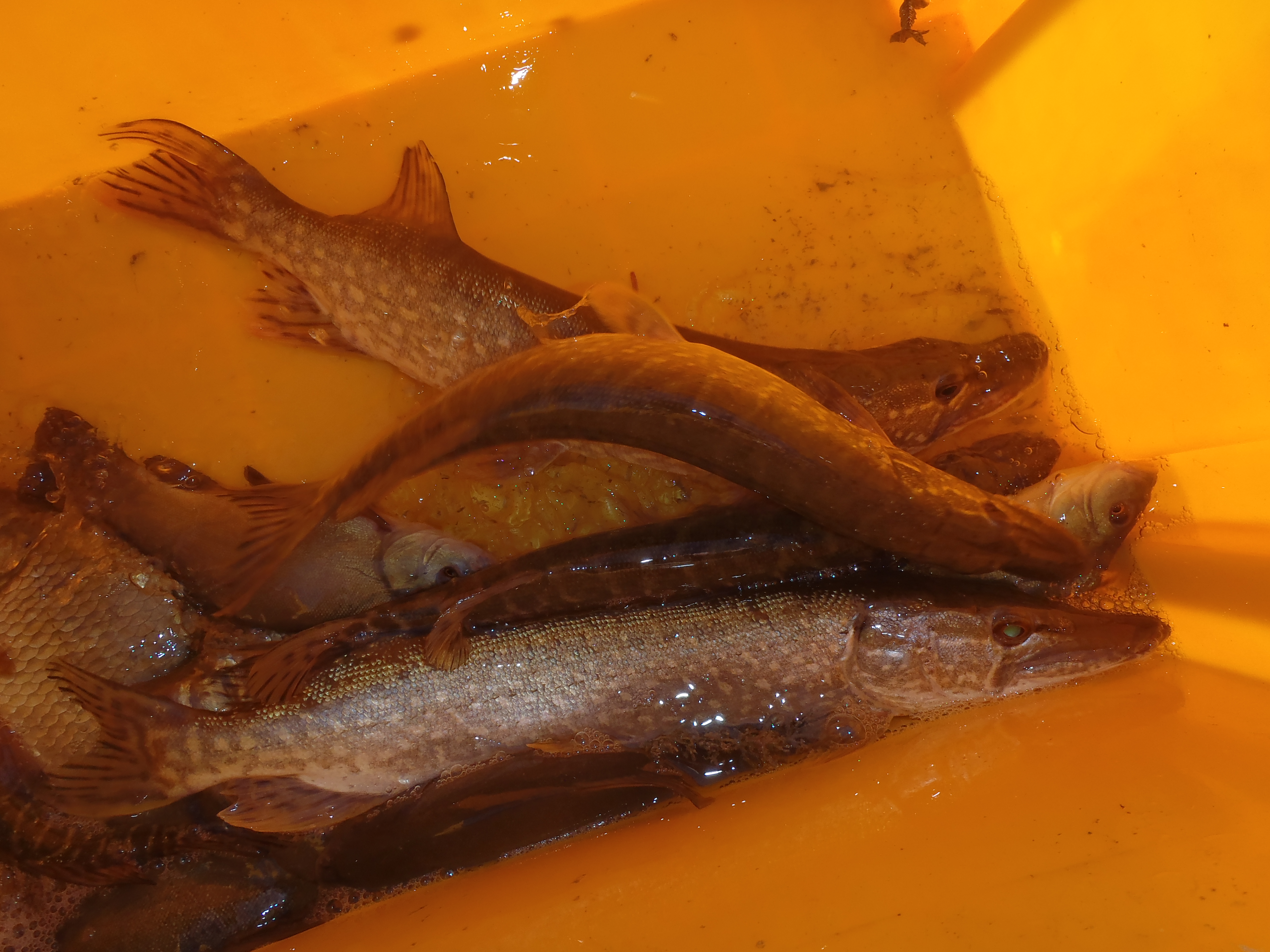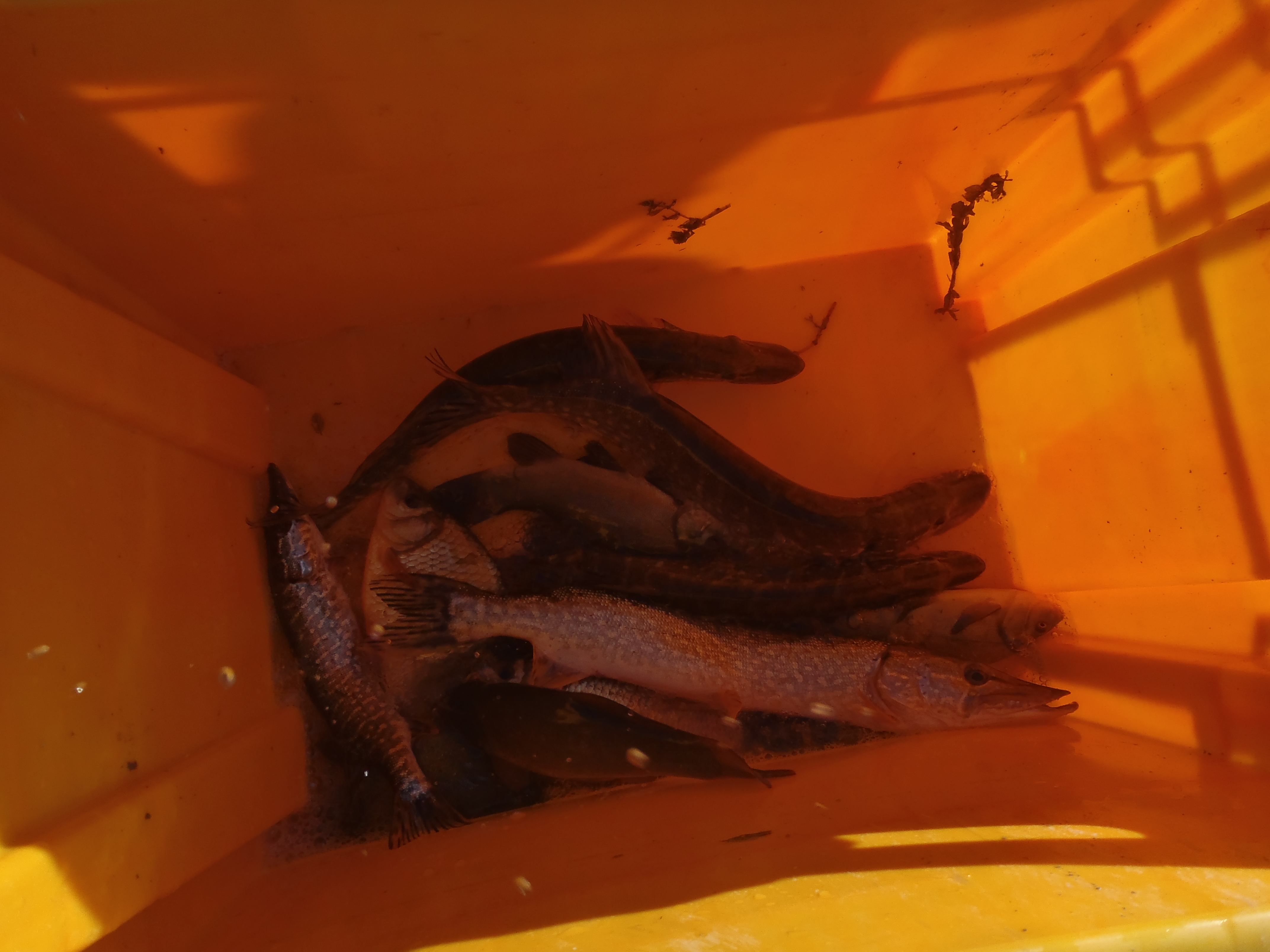 Ma reggel az idő kedvezett, így megvolt a mentés. Ahogy az előző bejegyzés hozzászólásainál már megírtam, tegnap 15 csuka került kívülre horoggal megfogva. Talán ezért is, meg mert horgászok a leghátsó bejáratot kövek kiszedésével újra járhatóvá tették az általam várt eredményt a halászok nem érték el. Csukákat, compókat és széles kárászokat sikerült a halászoknak leszedniük az elektromos halászeszközzel. Abban megoszlott a vélemény, hogy mennyi csuka maradhatott még bent. A halászok szerint csak elvétve, de a nemzeti parktól érkező Úr szerint, és szerintem is volt olyan hal ami a zaj hatására a nádasba, vagy víz alatti tuskók alá bújhatott. Egy biztos még legalább egyszer meg kell próbálnom, hátha van még mit kimenteni.