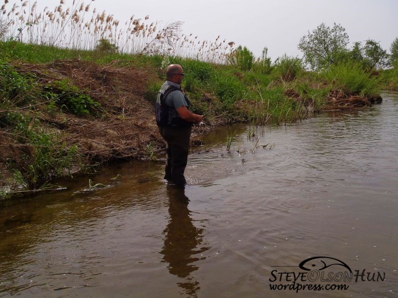 Felváltva, vagy egymással párhuzamosan dobva vallattuk a medret, dobáltuk a partszélt, úsztattuk a csalit a bokrok fák árnyéka alá nagyobb domiban reménykedve. Egy hibát azonban elkövettünk, nem bírtunk magunkkal, így folyásnak lefelé gázoltunk, ami nem túl ideális, de ez már így sikerült.