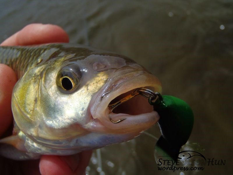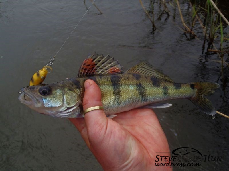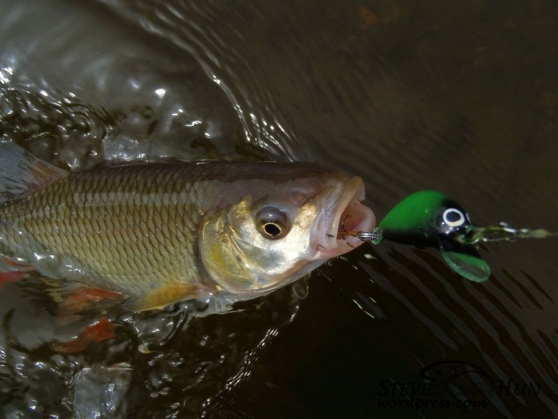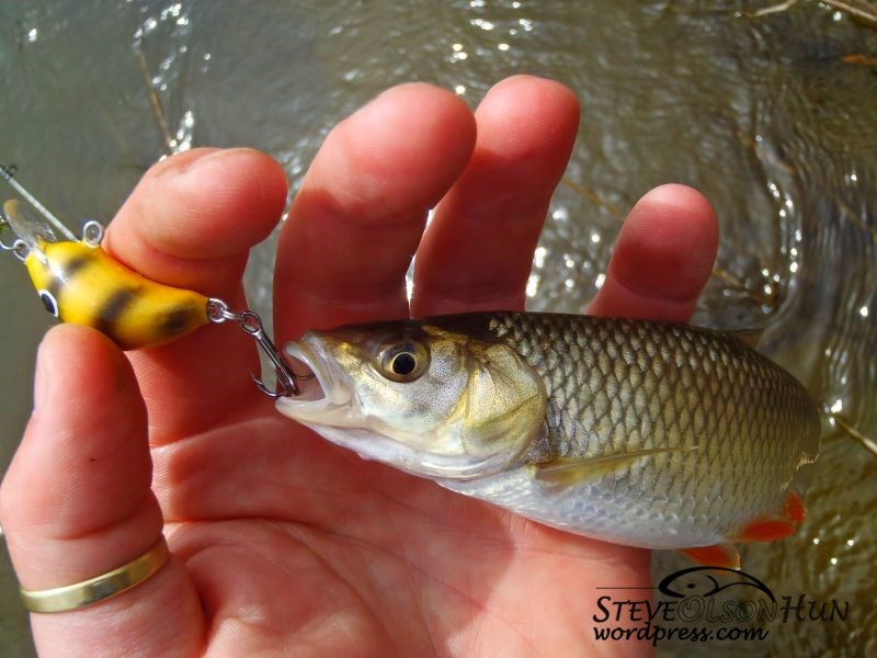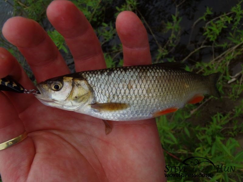 Próbáltam mindig úgy választani a csalit, hogy az adott vízmélységhez, terepviszonyhoz a legmegfelelőbb legyen, így került sor egy nagyon mély szakasznál a Hernádon már bizonyított kenart hunterre fekete/sárga színben. Jó választás volt, mert első dobásra domit adott.