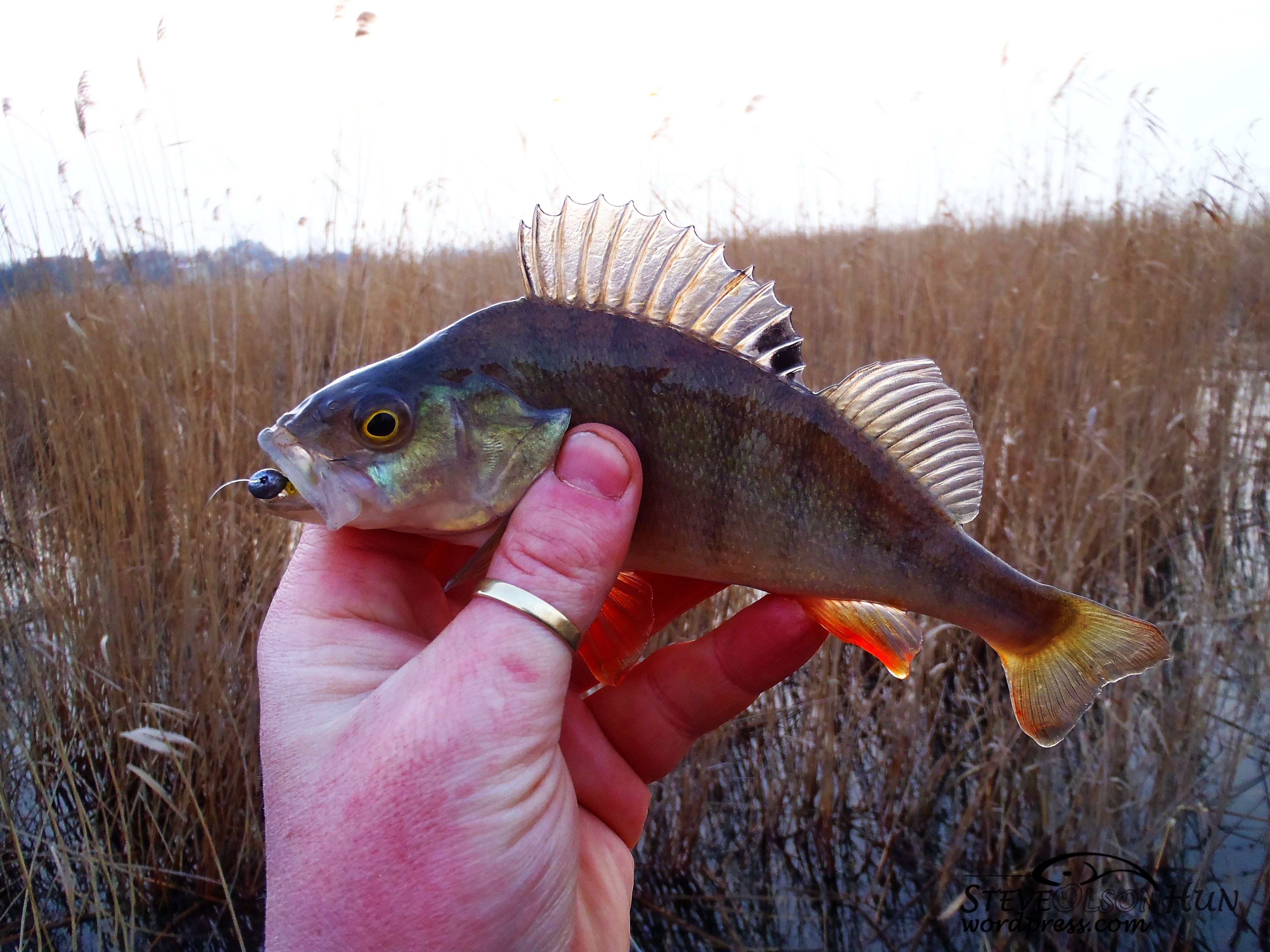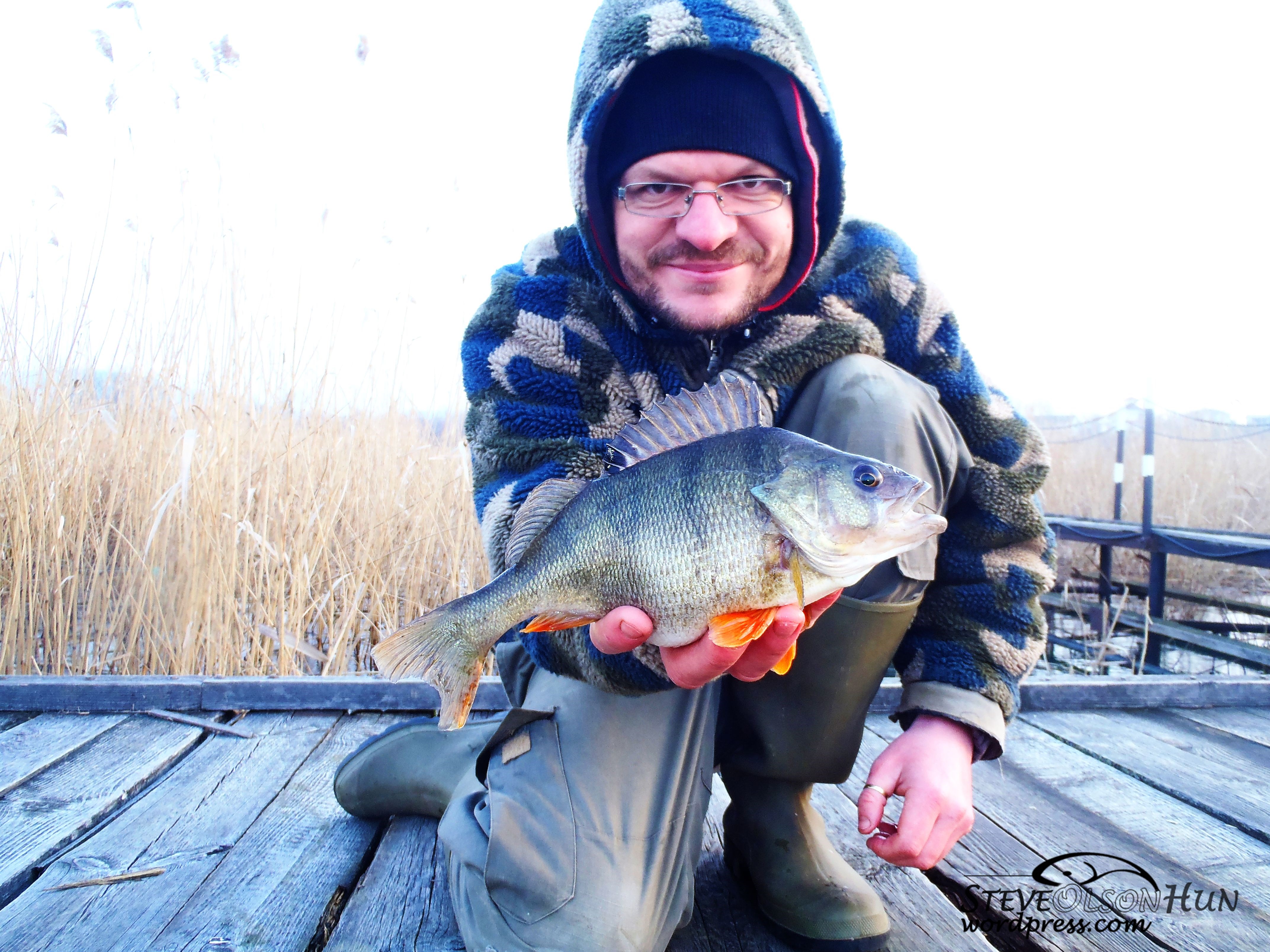 Az egyik beszakadás után aztán az előző nap nyerő színt kezdtem erőltetni, ami a nagy könyv szerint az igazán tiszta vízben lehet főként nyerő. az egyik finom emelésben brutális erejű ütés állította meg a kezemet! Először megfordult a fejemben, hogy csuka az illető, de hamar rájöttem, hogy kapitális sügér küzd a zsinór másik végén. 10-15 másodperc kellett, hogy felhúzzam, és még ennyit hagytam neki, hogy verekedje ki magát a víztetőn. Aztán egy mozdulattal megreptettem, és pont abban a pillanatban, amikor alányúltam jobb kézzel kipattant a jig a szájából, a hanyagul megkötött clinch csomó pedig kioldott. Az óriás a jobb tenyeremben pihegett. Nem életem leghosszabb sügéréről volt szó, hanem a legkövérebbről, abban 100 %-ig biztos vagyok.