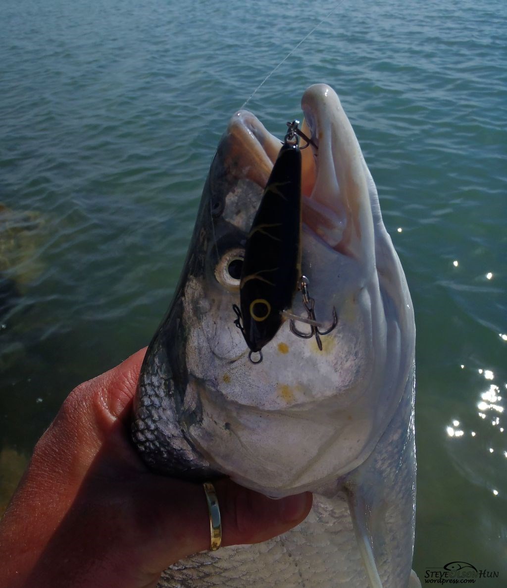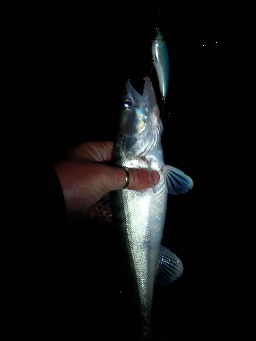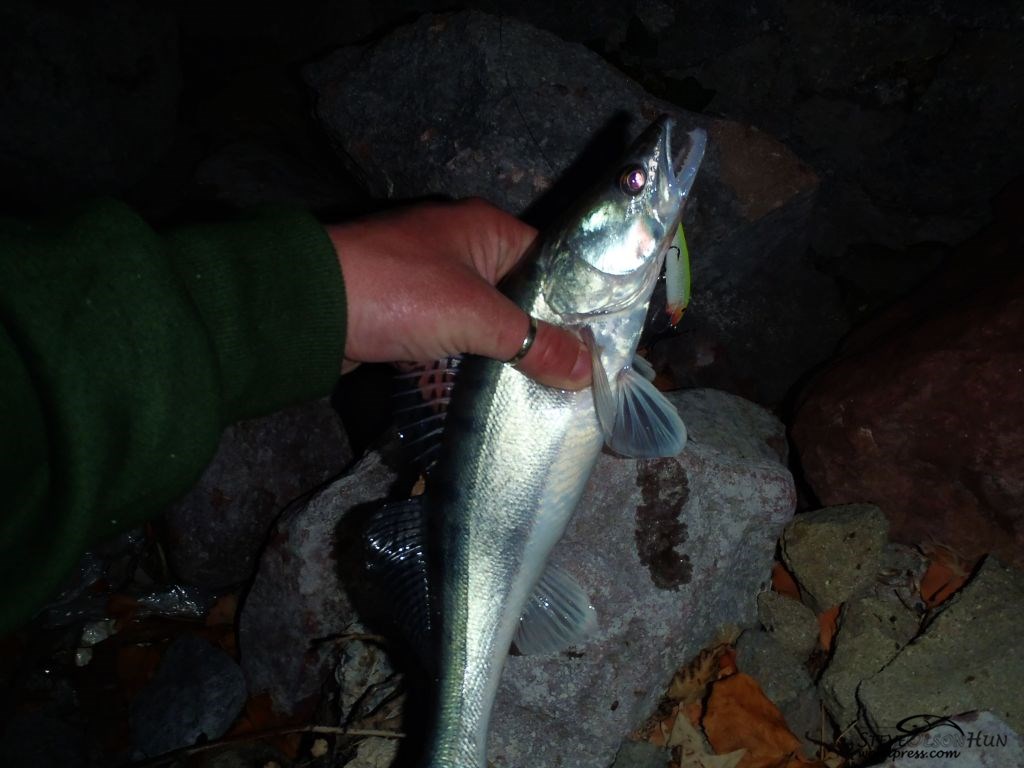 P5270185Horgásztársam amellett, hogy sokkal tapasztaltabb éjszakai süllővadász mint én, tán egy kicsit szerencsésebb is volt. Neki még két süllő, és egy szép köves adatott meg azon az éjjelen. Négy óra után aztán egyre több lett a balinrablás, így velük próbálkoztunk tovább. Most nem a középtempós wobbler, sőt nem is a popper, hanem egy gyorsan tekert fahal hozta az első kapást, ami nem kis meglepetést okozva nekem, egy kis süldő süllőgyerek volt.