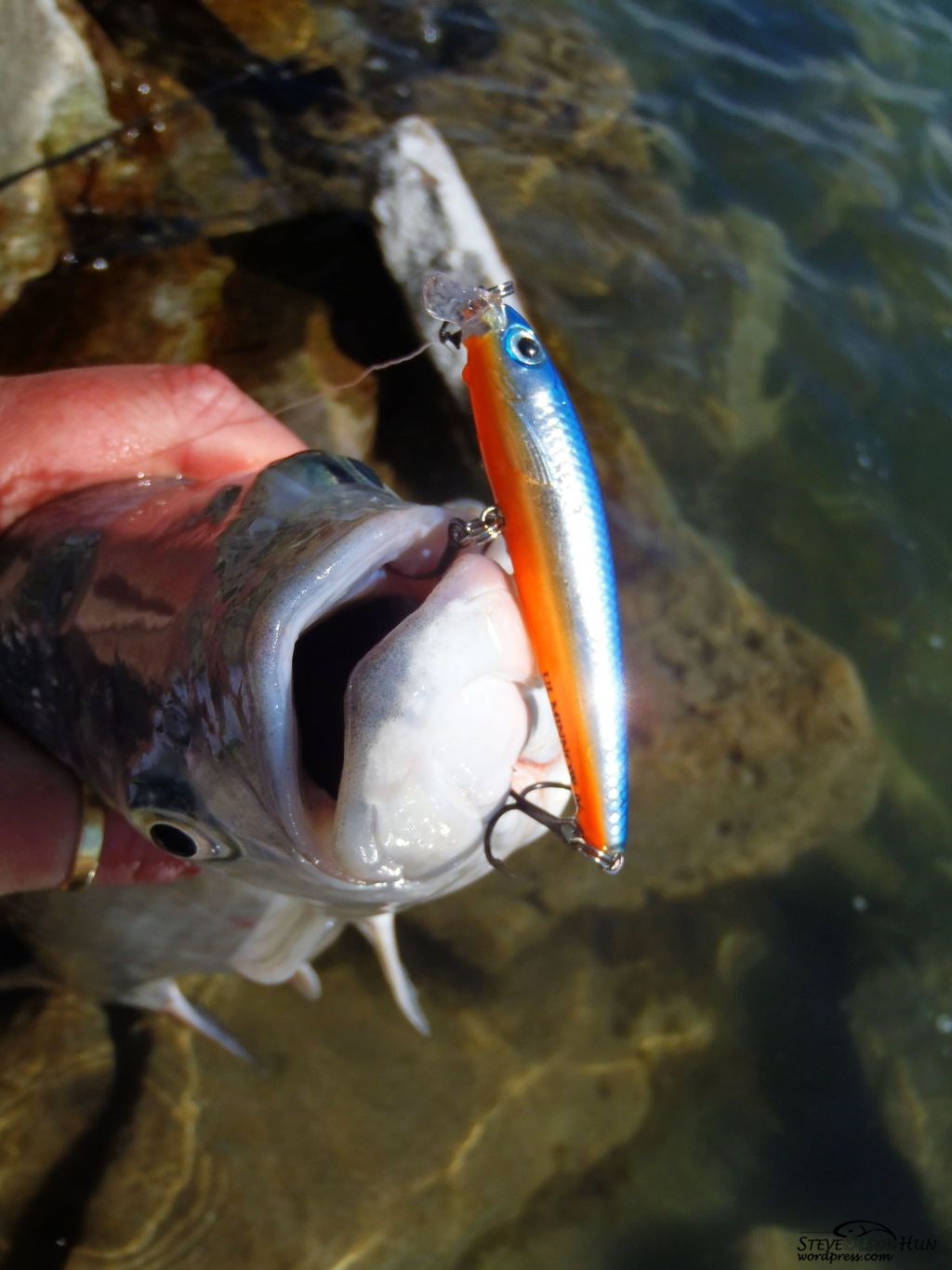 Mivel a helyi erő kicsit odébbállt (nem értem miért nem kapnak, pedig mindent próbáltam – persze ugyanaz a thrill lógott a drótelőkén egész nap), ezért visszaültem középtájra a külső ívre, hogy balra dobáljak. Egyet a kő elé, egyet a nyílt víz felé. Tervem bevált! A fekete/arany hendmédre bődületes kapásom volt, de a lábam előtt lemaradt. Más se kellett a helyi erőnek! Közölte kérdés nélkül is, hogy milyen szar horgaim vannak, bár azt hozzátette, hogy előző nap neki is lemaradt kettő.