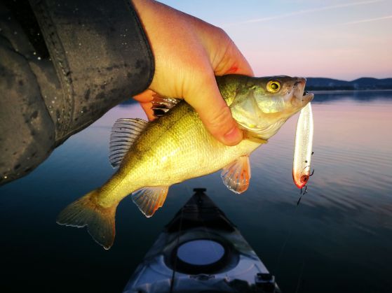 Ez már egy igazán jól sikerült hajnal volt így hamar haza is mentem, hogy másnap ugyanott kajakban várhassam a napkeltét. Hajnali négy előtt már kinyitott felkapókarral lesúlyozva vártam az első rablásokat, de nem akartak jönni. Aztán Somogyi Laci WTD-jére volt egy kapásom még sötétben és a nyílt vízen volt pár rablás, de nem volt őrület azon a reggelen. A sügérek sem hajtottak úgy és nem mozdultak a felszíni csalikra, így váltanom kellett. Az új a63 milliméteres szávázs jerkster már első dobásra kapást másodikra pedig gyönyörű csapót hozott. Aztán még vagy nyolcat! Sok akció volt, de nem mind akadt meg. Rángattam a csalit, néha megállítva. amikor éreztem, hogy érdeklődik valaki odalentről mindig megállítottam a csalit és a várva várt kapás sok esetben nem maradt el. Élvezetes a felszíni és a jerkes sügérpeca. Persze ehhez olyan pálya is kell ahol megeszi. Más peca ez, mint az UL gumis buziskodás! 😀