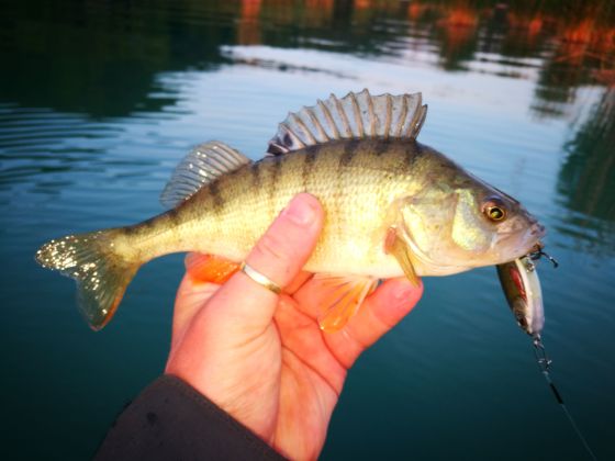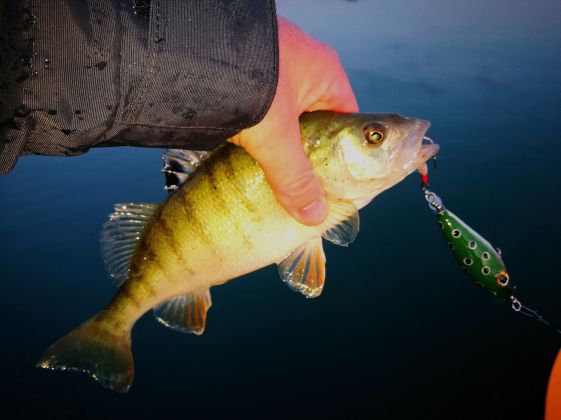 A nyílt vízen hatalmas rablás csattant előttem. A wobbler elakadt a hínármezőben így egy fehér hendméd poppert tettem a kapocsba. Akkora kapással jelentkezett a vélhetően termetes nyiltvízi őn, mintha egy tehenet vágtak volna be előttem a vízbe. Persze nem akadt meg! 😦 Sajnos az őn kapásával egy időben bejött a lötykölős nádra rátolós hullámzás. Ennek ellenére a tisztább öblök vallatását folytattam a 9 centis jerksterrel. A nap utolsó hala egy gyönyörű sügér lett, melyet a véletlennek köszönhetek, hiszen épp egy nádbabától próbáltam eltolni magam, így a csalit tovább hagytam süllyedni, és így támadta be a szép sügér.