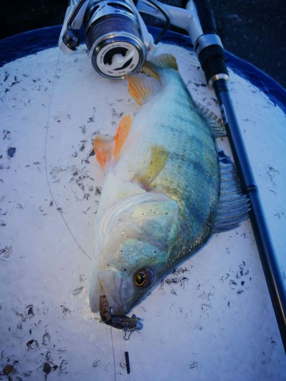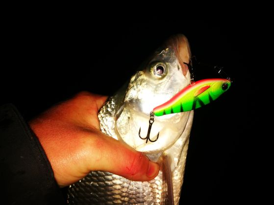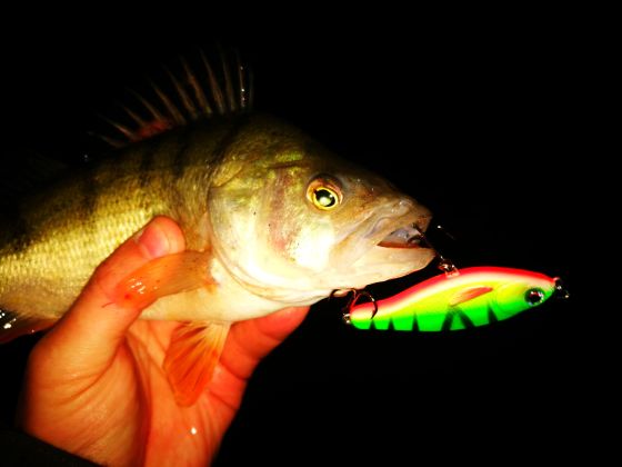 Egyik hajnalban megint azon vettem észre magam, hogy hajnali négykor ott ültem a sügéres – balinos pálya előtt a műanyag szivarban és vártam az első harsogó balinrablásokat. Valamiért ezek a rablások megint nem akartak jönni, ezért a tervezettnél korábban megint jerkelve, még sötétben megpróbáltam a sügéreket egy igen élénk színváltozattal. Az FT szín a mumusom. Eddig egyetlen csapósügért sikerült ilyen színű salmo friskyvel csípnem vagy ezer éve, de ezen a hajnalon bíztam benne. Első dobás. Rángattam ahogy kell. Kapás. Akasztás. Lemarad! 😦 Másodjára ugyanez lejátszódott, de a harmadikat sikerült megcsípnem. Megtört az FT átok! 😀 A képek ramaty minőségűek lettek. 2-3 sügér után jött egy balin is ugyanerre a csalira, majd következő dobásra megint sügér.