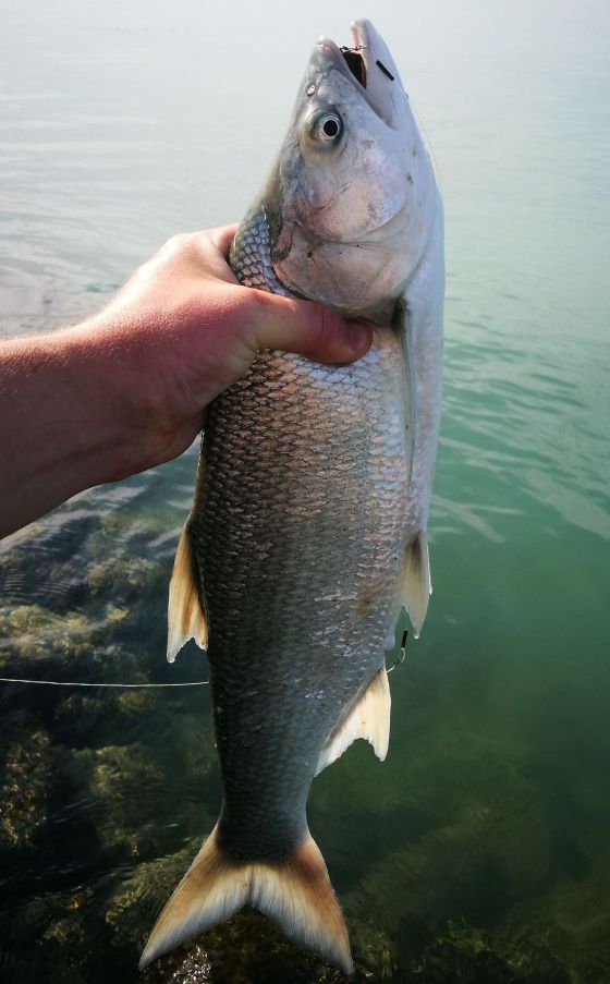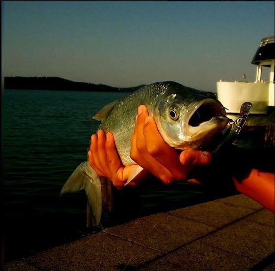 Miközben engedtem vissza a hajó sarkán csattant két rablás a közelben. Mivel ezek ilyen mélyebb vízrétegről jövő rablások voltak, ezért a twitch minnowt tettem fel. Hagytam süllyedni, két pöccintés, megint hagytam. Második dobás második pöccintés után verte le a nap legnagyobb hala. Marha jó erőben volt és simán elúszott annak ellenére, hogy egy hatalmas kelés volt a farokúszóján.