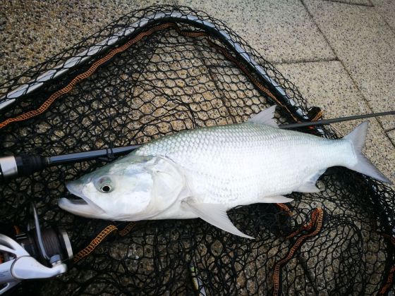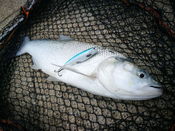 Ahogy gondoltam a mólóra még nálam is előbb érkezett. Erősen hullámzott, de napkeltével látszott, hogy van kishal a pályán. Távolban jöttek az első rablások, így először fat vibes-al, majd a múltkor emlegetett nem annyira szeretem távdobó horny herringgel próbálkoztam. Épp magyaráztam Bencének, hogy a hornyt se csak úgy tépve lehet húzni, mint egy balinólmot, hanem 4-5 tekerés után érdemes megállítani, ilyenkor remegve süllyed. Tudom, hogy Gebedjek Meg! De abban a pillanatban verte le a balin a csalimat! ![]()