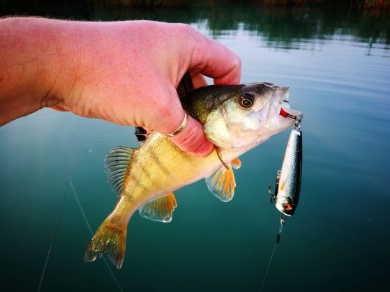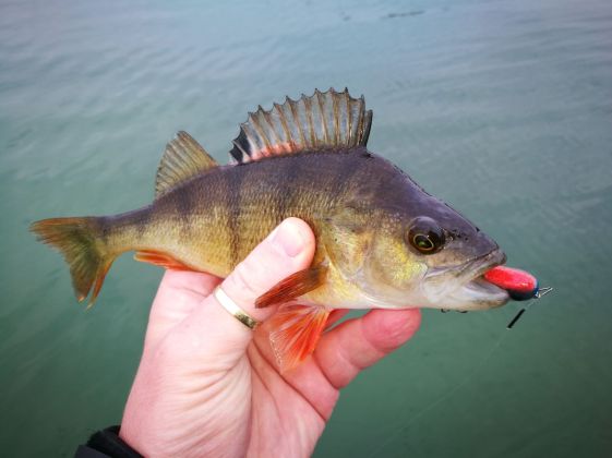 Fogtunk pár sügéret a stégen majd a rablásoktól ösztökélve kieveztünk. Az első halat ő ütötte a kedvenc kétrészes wobblerem olyan színváltozatával, amivel még nem rendelkezem.