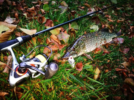 Végre elkészült az autóm, így ezt a napot két pecával szerettem volna keretbe foglalni. Mivel a szervizbe való rohangálás miatt szép lassan összejött egy fél napra való szabadságom, ezért azon a napon délutánra szándékomban állt kivenni a másik felét. Egy jót akartam végre horgászni. Csónakból. Jerkelve. Csukára. Ha már így alakult a hajnalt egy kikötőben kezdtem. Már úgy nézett ki, hogy betli lesz a vége, mert apró sügéreken kívül mást nem találtam, amikor ez a gyönyörű mintázatú, kövér kis csuka bearanyozta a hajnalomat.
