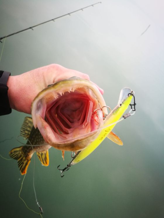 Sekély oldalt választottam. Az első 4-5 öböl nem adott halat, aztán észrevettem egy kajakost. Már majdnem elvette a kedvem, amikor leszedte a csuka a jerket. Kurva jó kapás volt! Ment is szépen a kövér csukesz. Szemből futott rá a csalira és mélyen benyelte.