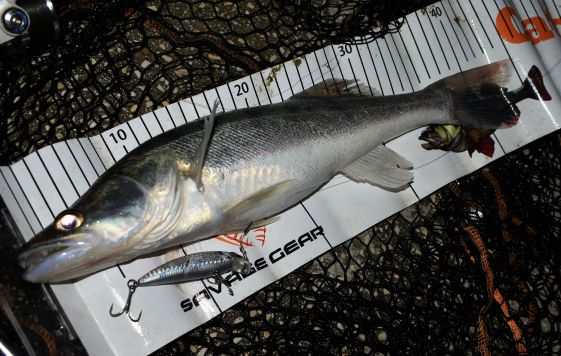 A következő fél óra nekem azzal telt, hogy megpróbáltam felszíni és jerk csalikkal átverni az egyre gyakrabban dolgozó őnöket. Neki meg azzal, hogy összeállítsa és beállítsa a végólmos, úszós szerelékét, amit azóta sem tudok mire vetett be. Nekem volt egy burványom a pop walker mögött, neki meg az ötödik húzásra sikerült bevágnia nyitott fékkel. Ennek ellenére sikerült megakasztania egy jó 10 centis bodorkát, amit rilizelt.