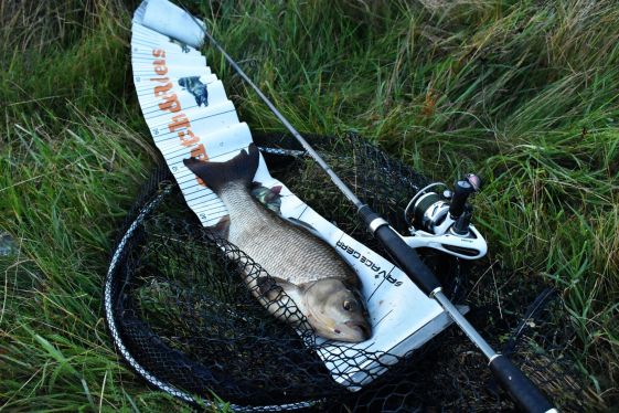 Az első beálló nem hozott eredményt. A másodikban amikor dobtam, észrevettem, hogy a töltésre felhajt egy autó. Barátom is megérkezett. Dobtam közben egy jó hosszút felfelé. Pár méter után valami megcsípte. Megálljt parancsoltam a kezemnek és hagytam a csalit a folyással sodródni. Brutális kapással szedte le, az akkor még jó balinnak gondolt hal. Amikor rövid tusa után megláttam a nagy fejét, már tudtam, hogy életem jászkeszege az. Szerencsére az előző peca óta beszereztem egy kihúzható nyelű merítőhálót, amivel a sáson és békalencse mezőn keresztül biztonsággal meríthettem a halamat.