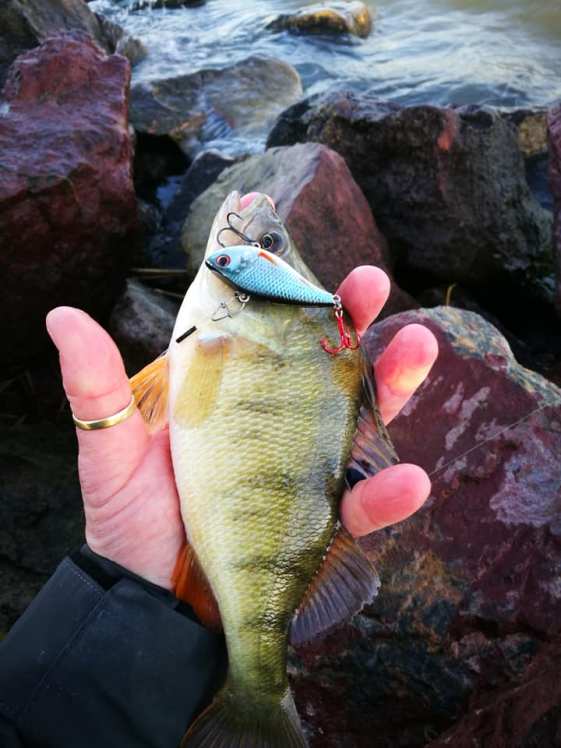 Mivel autóval mentem, így több csalit és két botot vittem magammal. Szó mi szó a szél a jóslatokkal ellentétben még jobban fújt, de kapás az volt. Nem kevés. Már második dobásra, csak éppen nem akartak megakadni a halak. Egy kisebb süllő mellett aztán az FT fat vibes adott egy egész szépet míg a nyerő csali bent nem maradt a kőben.