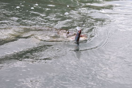Az első kapás nálam jelentkezett egy olyan helyen, ahol még az életben nem fogtam halat! Behibázta. Láttuk a buborékokat a nyomán. Zolika ráküldte a kanalat, de nem érdekelte a csukát. Én is visszadobtam a 4play V2 nyelves változatát, amit pénteken vettem kézhez. Nagyon durván durrantotta le a lassan felúszó csalit, gyakorlatilag felszíni kapással egy 85-ös csuka. Beszarás volt!