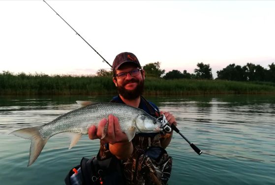 Az utolsó hajnalon, ami kajakból cicadás balint adott egy barátommal mentem ki. Ő partról próbálkozott. Sajnos a halak nagy részét nem tudta elérni, így csak kapásokig jutott. Nekem voltak akcióim, kézben tartott halaim, amikor egy darabosabb jószág rabolt előttem. Tudtam, hogy mivel kell megcsípnem. Brutális kapással szedte le a kajaktól pár méterre húzott felszíni csalit!