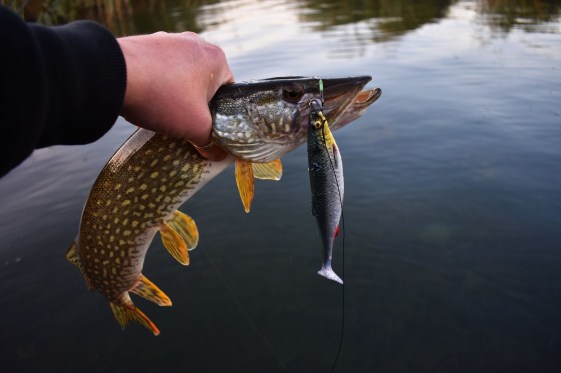 Ahogy csorogtam tovább végre a képen látható csukát sikerült egy jó kapás után megcsípnem, aztán pár méterrel odébb egy újabb 60+os kétszer megütötte a gumit, de nem akadt meg. Aztán ott állt előttem 5-6 méterre a vízben. Próbáltam két másik csalival kapásra bírni, de nem érdekelte. Flegmán elúszott egy idő után.