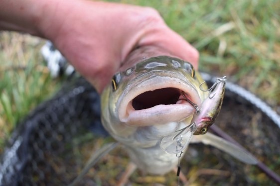 Ahogy leértem a zúgóhoz brutális rablás fogadott. Mivel hónap közepén jártunk sanszosan leívtak már a balinok, így erősen benne volt a pakliban, hogy egy ragadozó őn az illető. Ezt csak úgy tudhattam meg, hogy rápróbáltam Levi kis minnowjával. Második dobásra brutális kapással jelentkezett odalentről valaki. Mélyen védekezett, domolykós fejrázásokkal. Amikor kidugta a fejét a tajtékzó vízből, akkor megláttam, hogy a hatalmas domolykószáj szélén egy horog éppen tart egy hártyát. A merítőfej már a vízben volt, amikor rúgott egyet és elment a böszme jószág. 😦