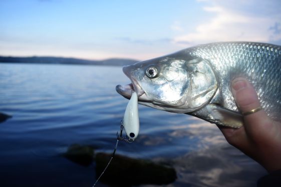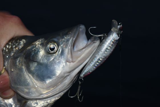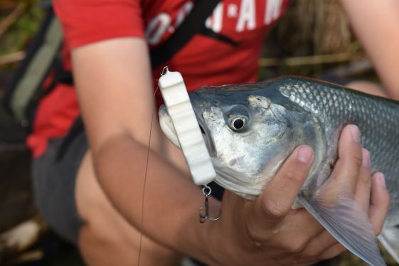 A körülmények miatt volt egy csalitippem, de előbb még dobtam néhányat felszínikkel is. Tisztán látszott, hogy nem akarja a jó balin megenni a topwater csalikat, így elővettem a kicsi jerkstert a régi roach színben. Felszín közelében rángattam, hogy ne szedjem össze a hínarat, amúgy is azt vettem észre, hogy sokszor gyors tempóban szeretik ezt a csalit és most is így történt. Talán ötöt ütöttem vele, amikor lezúzta egy jó balin, szinte teljesen felszíni kapással.