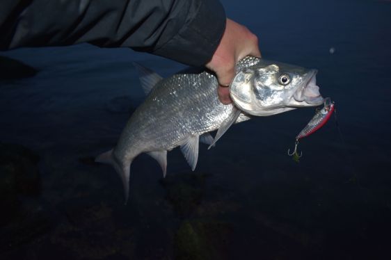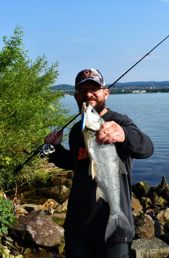 A bástyán sajnos megint ketten horgásztak, így tőlük jó 30 méterre mentem le a vízhez. Szakadó esőben a dévéreket, küszöket látva a 7,5-es waveshad került a kapocsba süllő reményében, de már a kapásból tudtam, ez nem süllő és nem is balin lesz. 😀