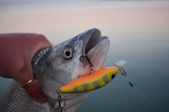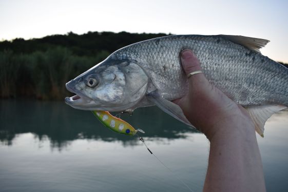 Volt egy ami kiszaltózott, úgy, hogy a hal jobbra a csali balra repült. Gyorsan kicsévéltem és újra dobtam. Amikor a kapás helyére ért a csali, robbant a víz, repült a balin és másodjára már nem hibázott! 😍