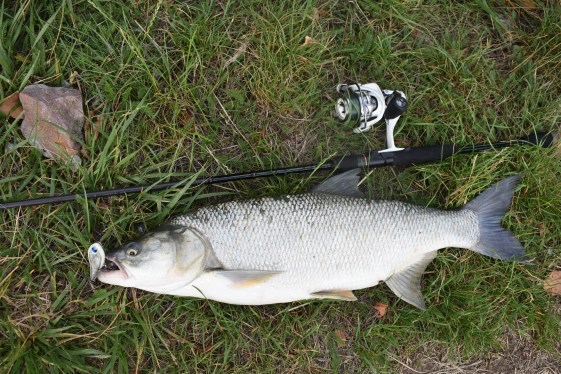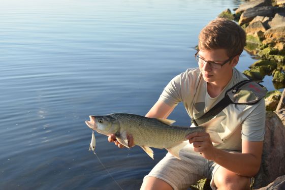 A nap kapása később egy lépcsőn állva ért. Egy balin rabolt be tőlem jobbra egy bokor takarásában, majd elém kanyarodva a nyílt víz felé indult. Pár méterrel elépöccintettem a legkisebb fehéret és 1-2 ütem után nem hagyta tovább a felszínen táncoló axehadet szambázni. Látott kapással durrantotta le! 😀