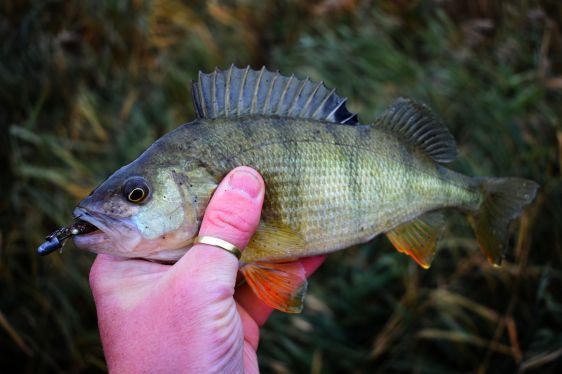 Az első teszt alkalmával mindjárt sikerült gyönyörű sügérekkel avatnom a kis pálcát. Ekkor még a szokásos 3dfry gumihalak és a különböző színű pvc mayfly nymph csalik voltak terítéken. A botra egy 1000-es méretű okuma inspira tökéletesen passzolt. 0,09-es fonottal és 0,26os fluoro előkével vetettem be a kemény terep miatt. A meleg ősz miatt a stég körül még sűrű volt a hínár és a nád, sokszor azt sem láttam hová engedem le a csalit. Sajnos még ennél a zsinórvastagságnál is elég gyakran kellett beszakítanom a motyót, amikor bele akadtam egy – egy horogmarasztaló tereptárgyba, nádszálba. 😦
