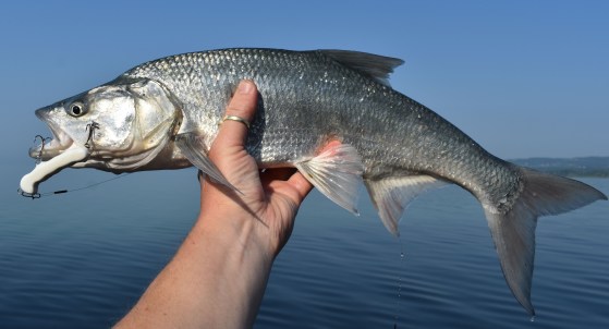 Halkan a hínármező közelébe eveztem, aztán letettem az evezőt és csak csorogtam a hal irányába. Bíztam benne, hogy hínárlakó balinról van szó, ami a revírjéből támad és bejött a számításom. Hatalmas szaltóval verte agyon a vékony falatot.