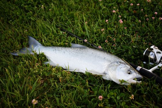 Aztán beindulni látszottak odébb is. A part mentén, fél távon és messzebb is dolgoztak az őnök. Végre fogtam egyet wobblerrel. Szerintem a pálya legkisebb, alig negyvenes halát, majd egy hosszra már jó, de szinte anorexiás balin következett.