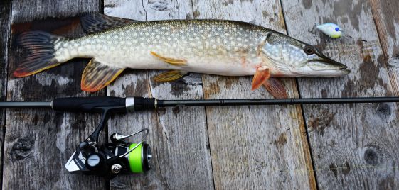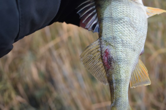 Az egyik pecán tele volt kishallal a stég előtti rész is. Tavaly ilyenkor, magasabb víznél szépen ráálltak erre a balinok. Rablást ugyan nem láttam, de gondoltam dobok párat. Csóri csalit első dobásra be is darálta ez a nem éppen óriási csuka. Műteni kellett elég rendesen.
