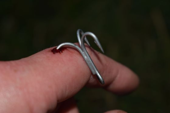 Na gyorsan valahogy leszedtem a csalit a horogról és megpróbáltam kitépni háromszor is az ujjamból, de nem adta. Aztán megpróbáltam átfordítani, de képtelenség volt, így a horoggal az ujjamban folytattam.