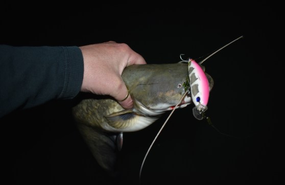 Nem volt idő bánkódni, éreztem a halat a helyben. Pár dobás után váltottam a 9,5-es wave shadre, bazinagy 3X-es VMC horgokkal és meg is jött a következő kapás. Igaz kisebb, de végre harcsa, saját csalira, immáron hivatalos időben. 😀