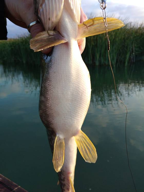 Furcsán, szinte végig sérült volt a háta és a farokúszója is véres volt. Valószínű az előző napok hullámzása csapkodta kicsit neki a búvóhelyének. Életem első akadópecán fogott méretes süllője, saját csalival. Ráadásul nem is az az éppen méretes.