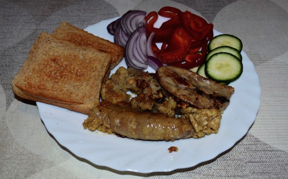 Közben már készül is a pirítós, amit jól meghúzkodok a foghagymás vajban. Majd némi friss zöldséggel tálalom.