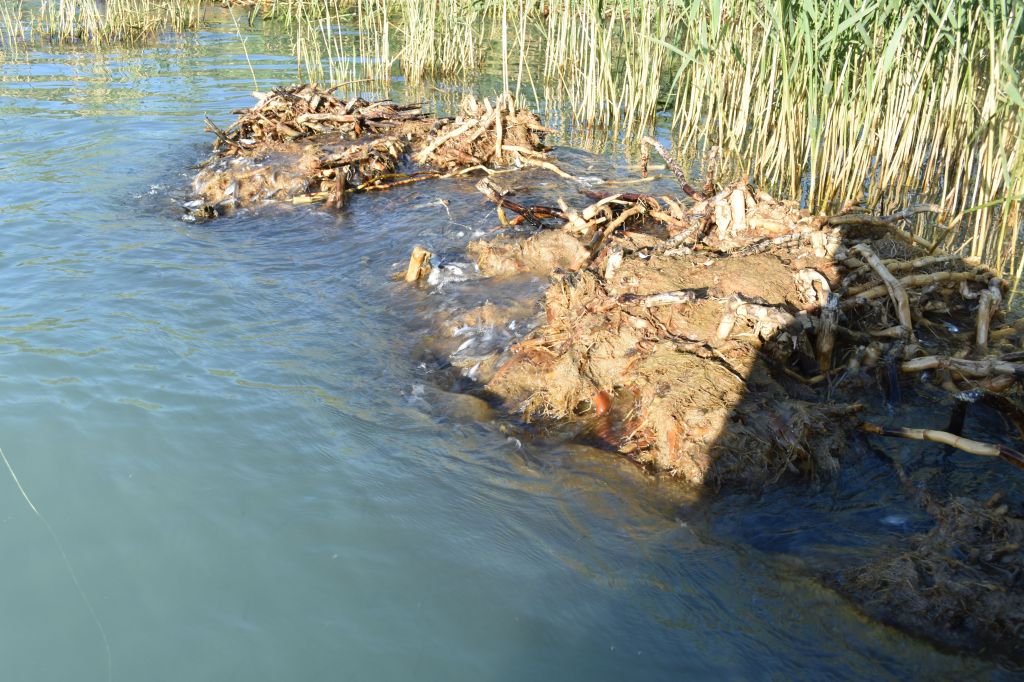 Ezen a szél és hullámzás által felszaggatott torzsán ívott a küsz. A képen látszanak is a kishalak ahogy kidobálja a hullámzás. Tök jó pecák vannak ezeken a szél és hullámzás által felszaggatott torzsákon, csak éppen ez is egy jele annak, hogy pusztul a nád. 😦