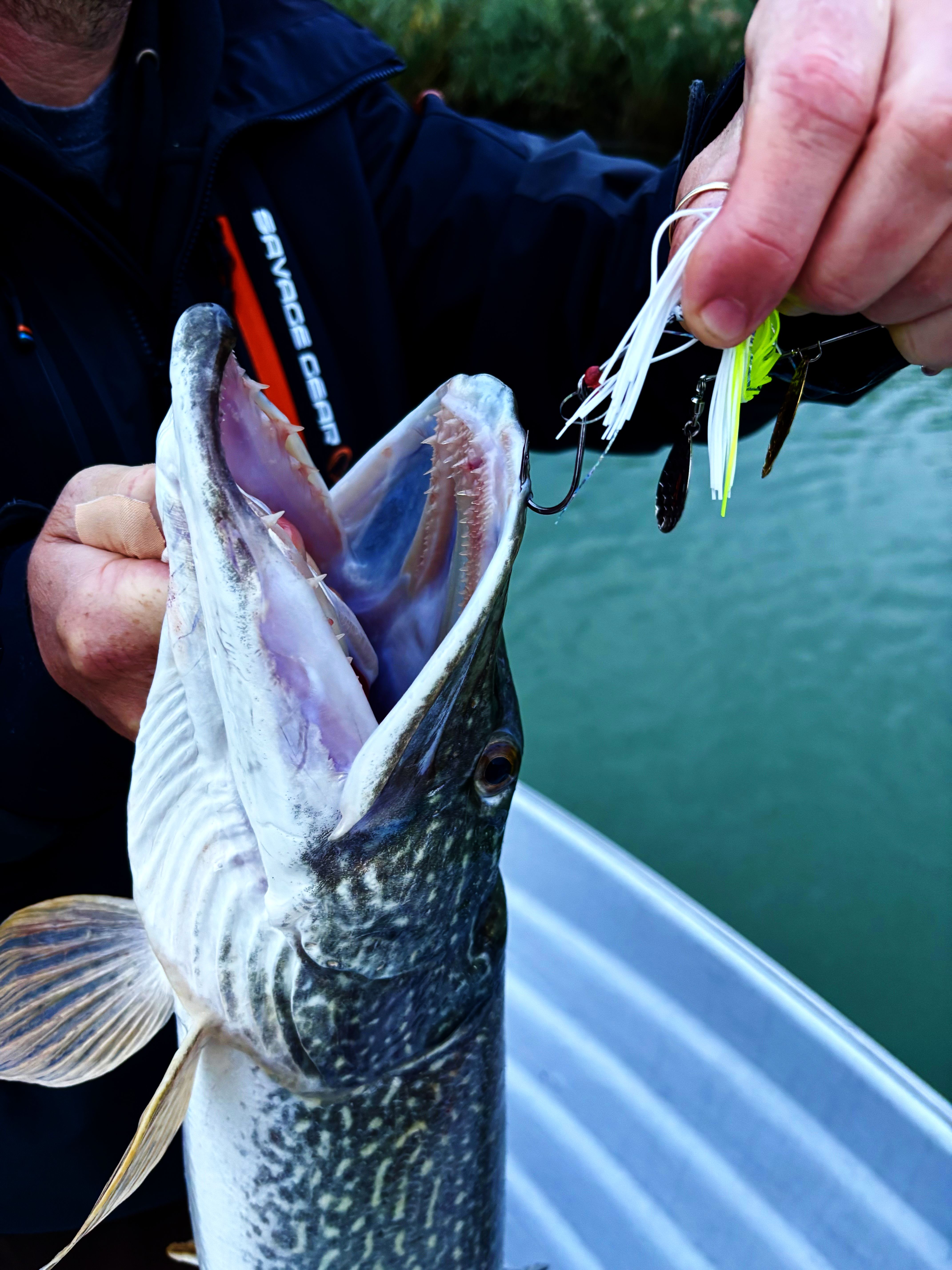 A csuka pedig ment a csónak alá, ment volna a motorba, rázta magát bolond módon és bizony mindketten láttuk, hogy piszkosul vékonyan akadt.
