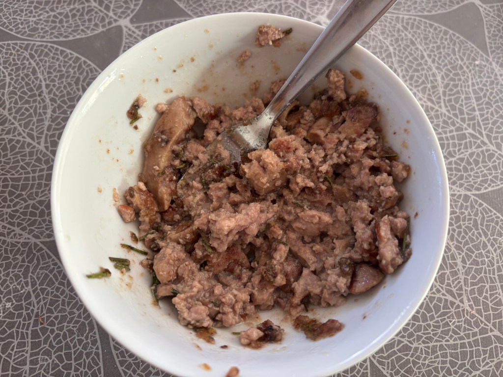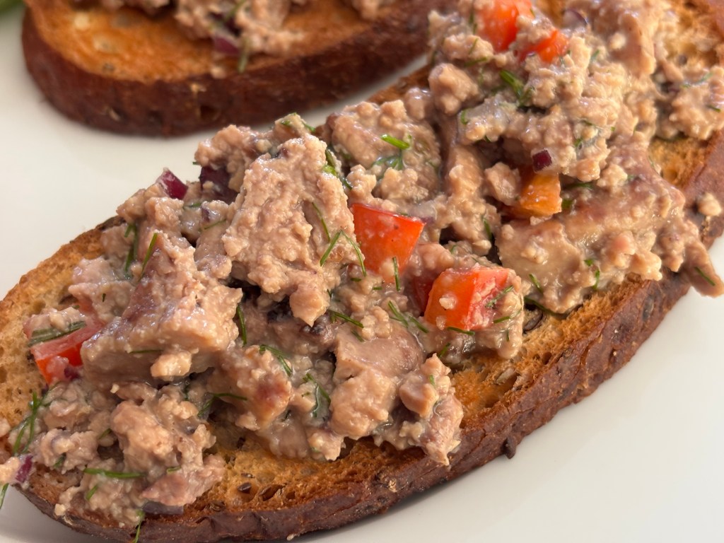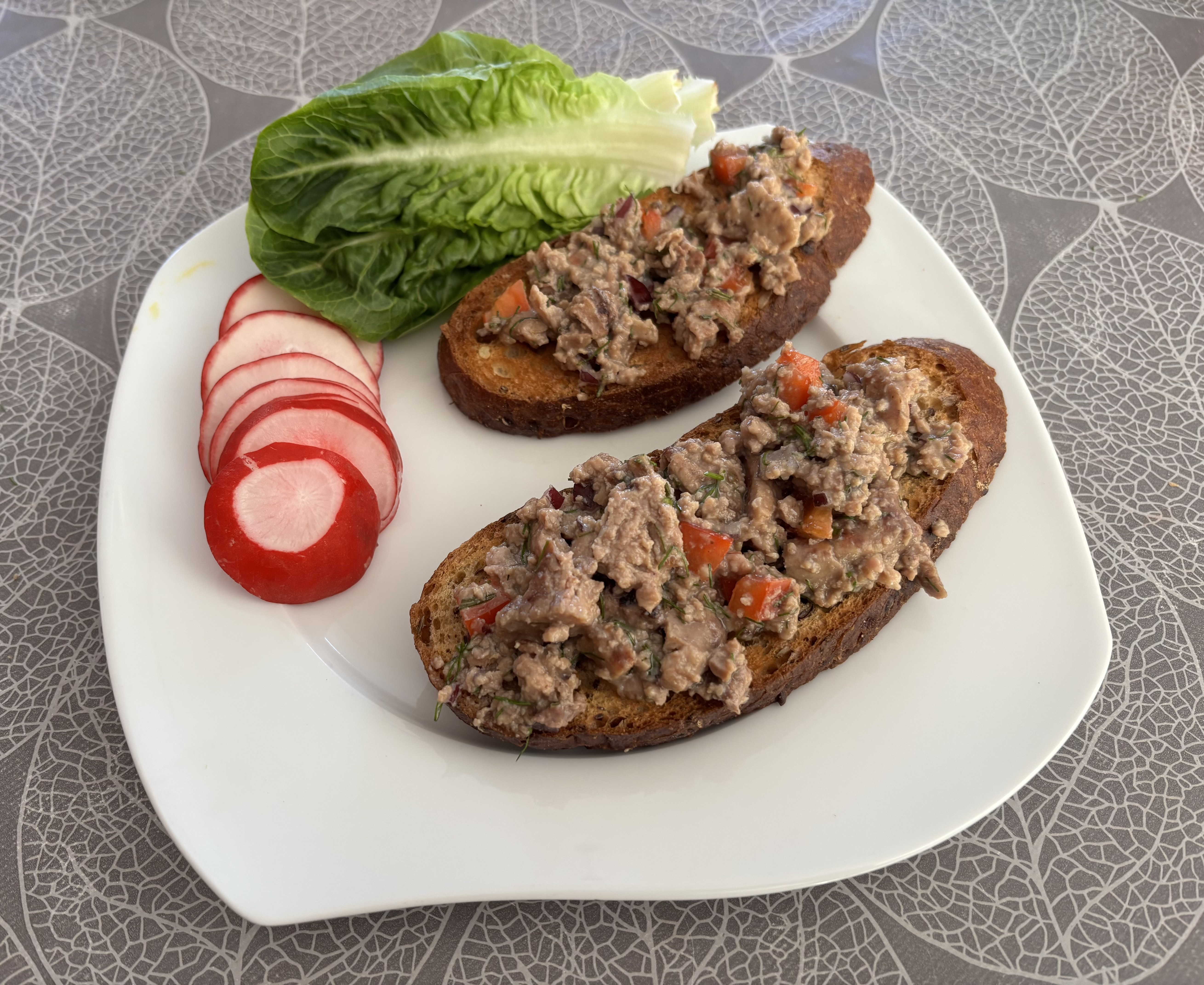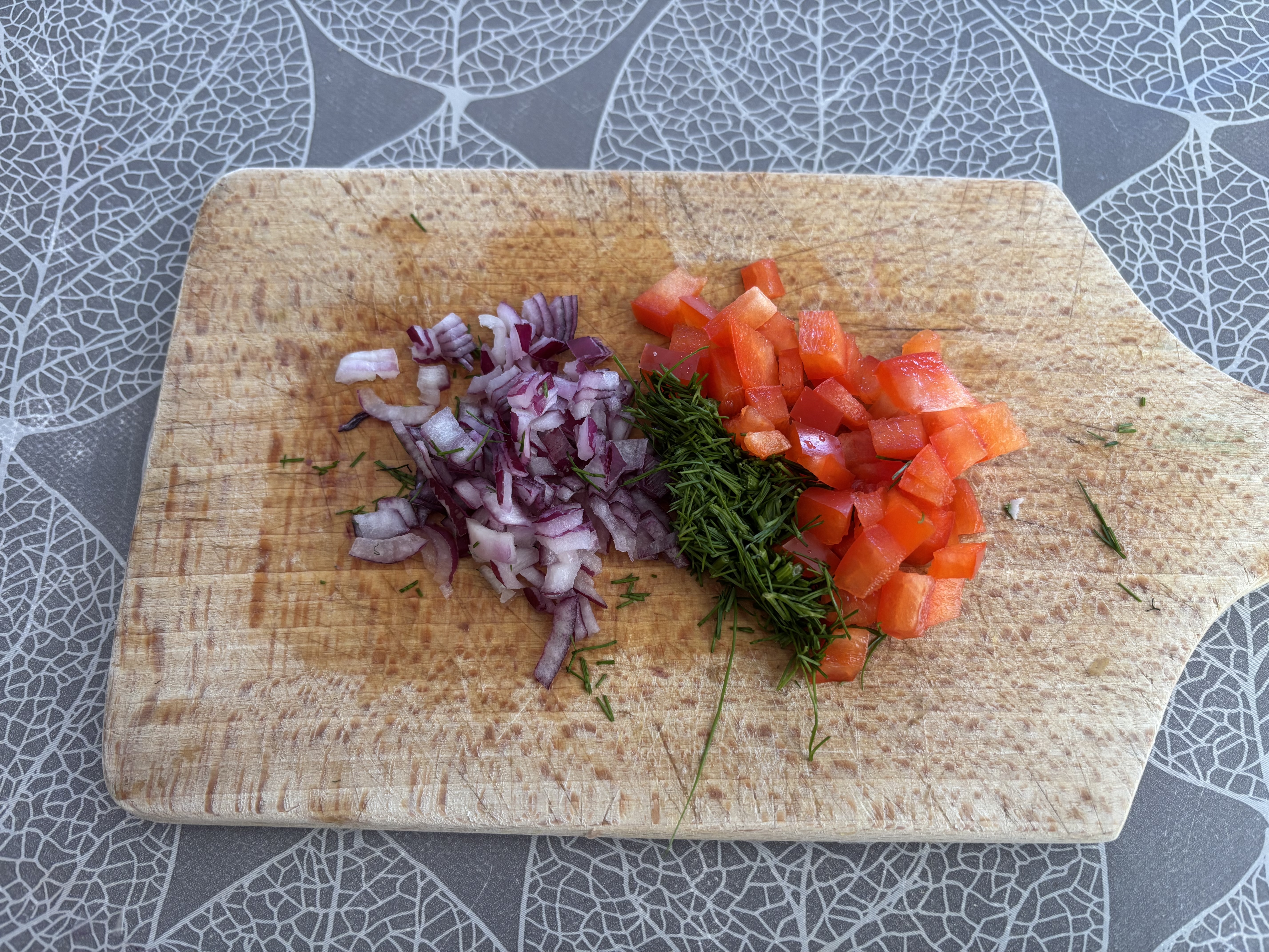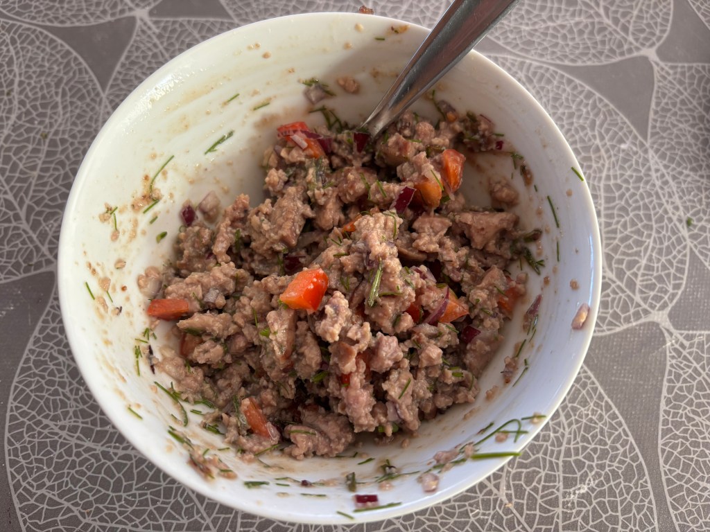 Lila hagymát, kaliforniai paprikát és némi kaprot apróra vágtam, és a villával összenyomkodott májba kevertem, nyersen.