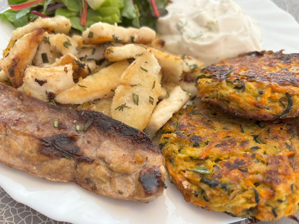 Ebédre pedig nem más volt a menü, mint burgonyás harcsapogácsa, némi friss zöld és kapros – tejfölös mártogatós kíséretében.