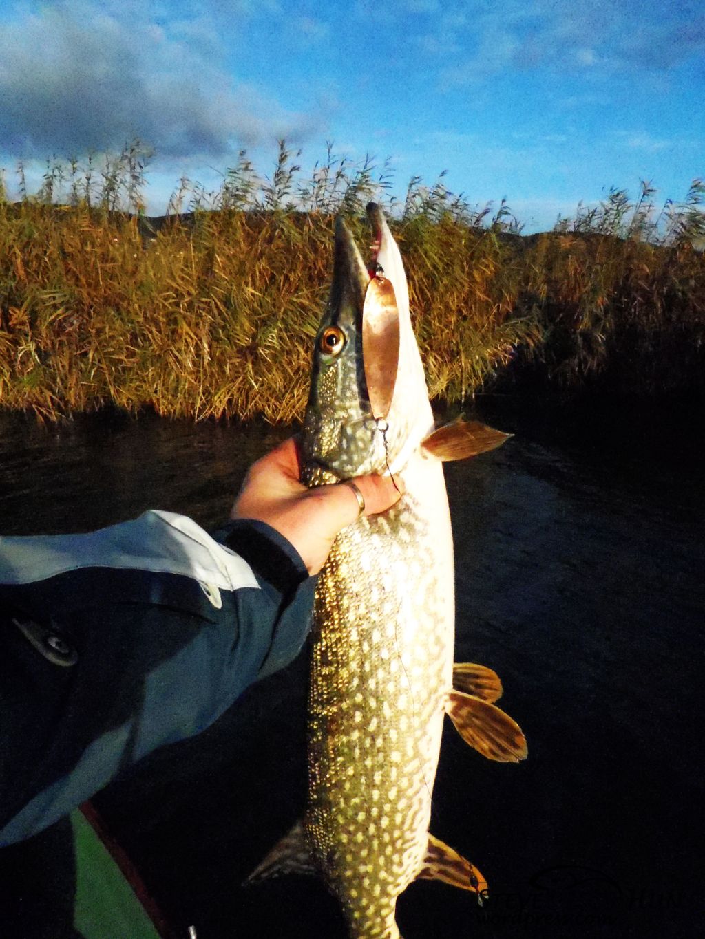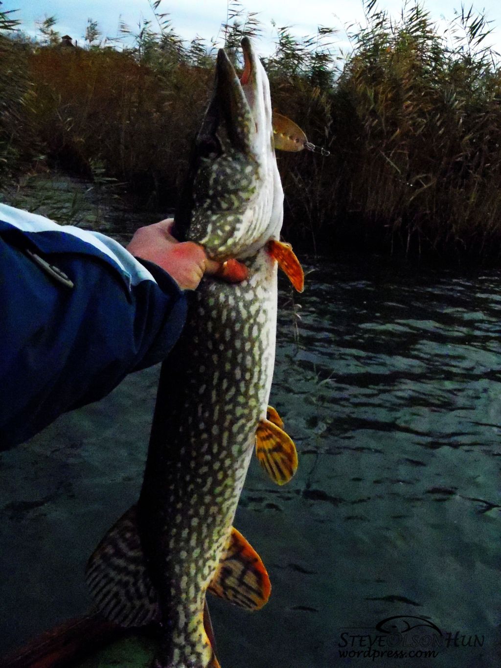 Lassan elértem a helyet, ahol tavaly a legszebb csukát fogtam. Lassan bele-bele emelve húztam a kanalat a víz alá süllyesztett stég felett, amikor BÁÁÁM! Ez a hal megakadt, de csak 5-6 másodpercre! 😦 Egyszerűen nem értettem miért, hiszen a horog is tűhegyes volt, valószínű, hogy ez a hal sem volt elég határozott. Alig csorogtam odébb, amikor BÁÁÁM! Ez végre megakadt! Épphogy szájszélben, mintha az előző 55-ös forma ikertestvére lett volna. Vagy legyen inkább 56-os a mai nap tiszteletére!