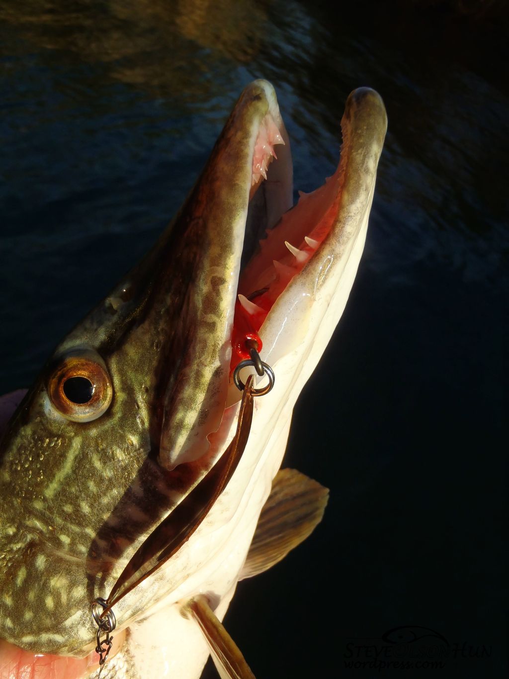 Körülbelül reggel 7-kor csobbant először kedvenc gipo kanalam a kristálytiszta vízbe, a stég melletti első öbölben. Egészen a harmadik öbölig nem volt sem akció, és a múltkori babahalrajok sem mutatkoztak. Aztán pár apró ütés jelezte, hogy az előző alkalommal megtapasztalt sügérdömping továbbra is tart. Volt, hogy 10-15 sügér követte a kanalat a csónakig, de, ahogy legutóbb, így most is megálltam, hogy dobjak rájuk. Tán a negyedik beállóban dobtam egyet srégen a nád előtt a nyílt víz felé, ugyanott ahol legutóbb egy 80+os óriás 1 méteren keresztül tolta a kanalat az orrával. Szóval emelgettem a kanalat, és amikor a nád mellé ért BÁMMM! De pármásodperc után lemaradt! Szentségeltem rendesen, aztán gyorsan visszatettem a kanalt, hátha újra ráfordul. Szerencsém volt, újra leverte egy 55-ös forma csuka, melynek állcsúcson nagyon vékonyan akadt a hármashorog egyetlen ága. Vasárnap 6 kapásból sikerült a 2 halat abszolválnom, most is hasonlóra számítottam. Talán az erős napfény, és a tiszta víz, vagy a tavaszias időjárás miatt nem elég határozottak még a csukák. Hűlni kell az időnek!